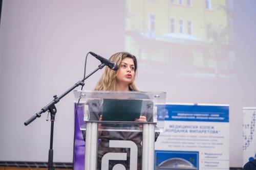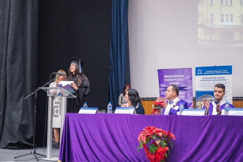 Приветствие от името на колегите си отправи отличничката от специалност „Зъботехник“ Кристин Малашевска, а музикален поздрав поднесе студентката от трети курс Мартина Пейчева, също от специалност „Зъботехник“.