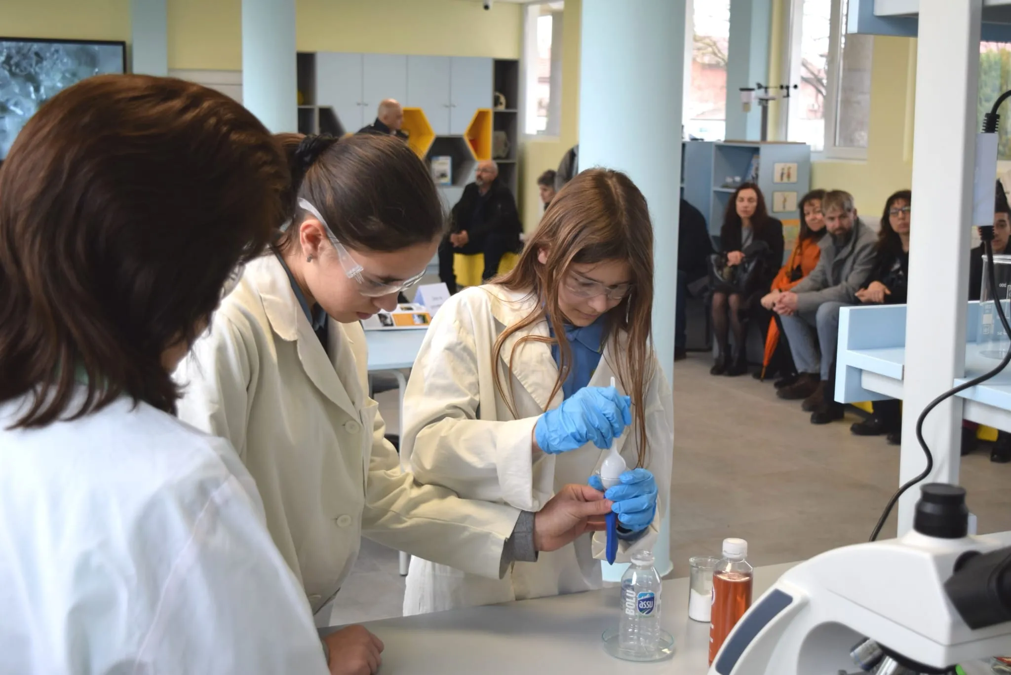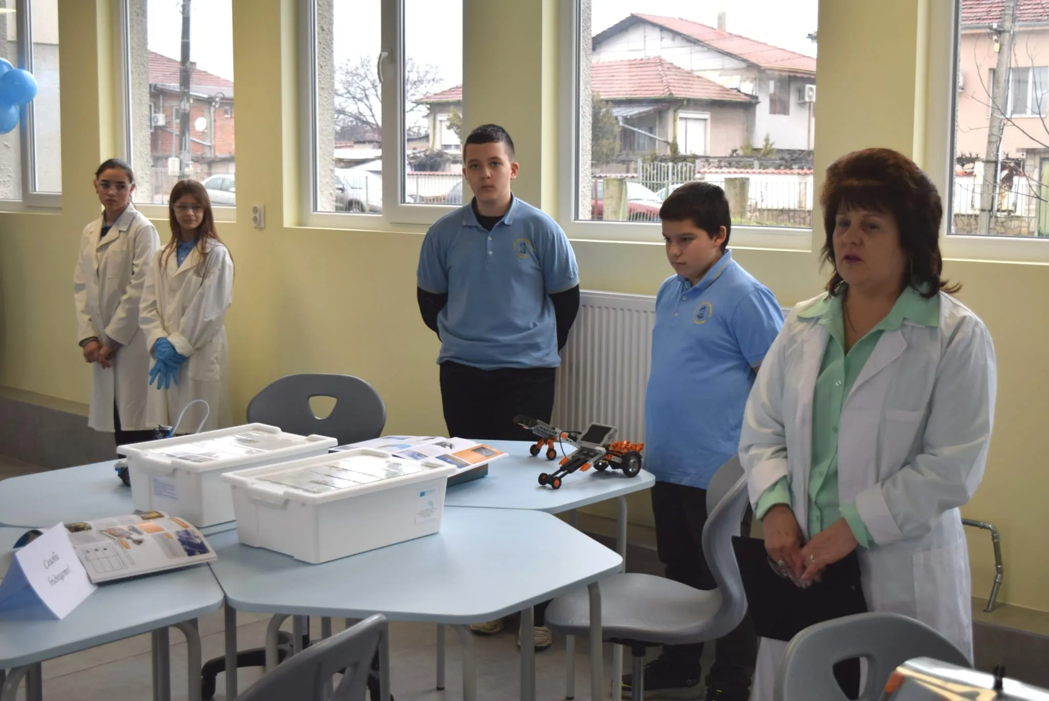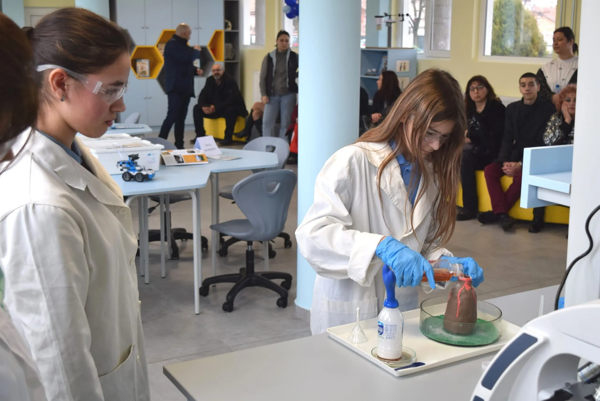 След това ученици демонстрираха част от възможностите на новия център. Младите лаборантки Ванеса и Елка представиха химичен експеримент, при който чрез смесване на сода и киселина се отделя въглероден диоксид. Калоян показа възможностите на дигитален микроскоп от ново поколение при изследване на различни материали, а бъдещите инженери Никола и Марти демонстрираха добиване на енергия от различни източници, включително приложението на слънчевата енергия чрез соларни панели, които могат да задвижват модели на превозни средства и самолети – символ на „автомобилите на бъдещето".