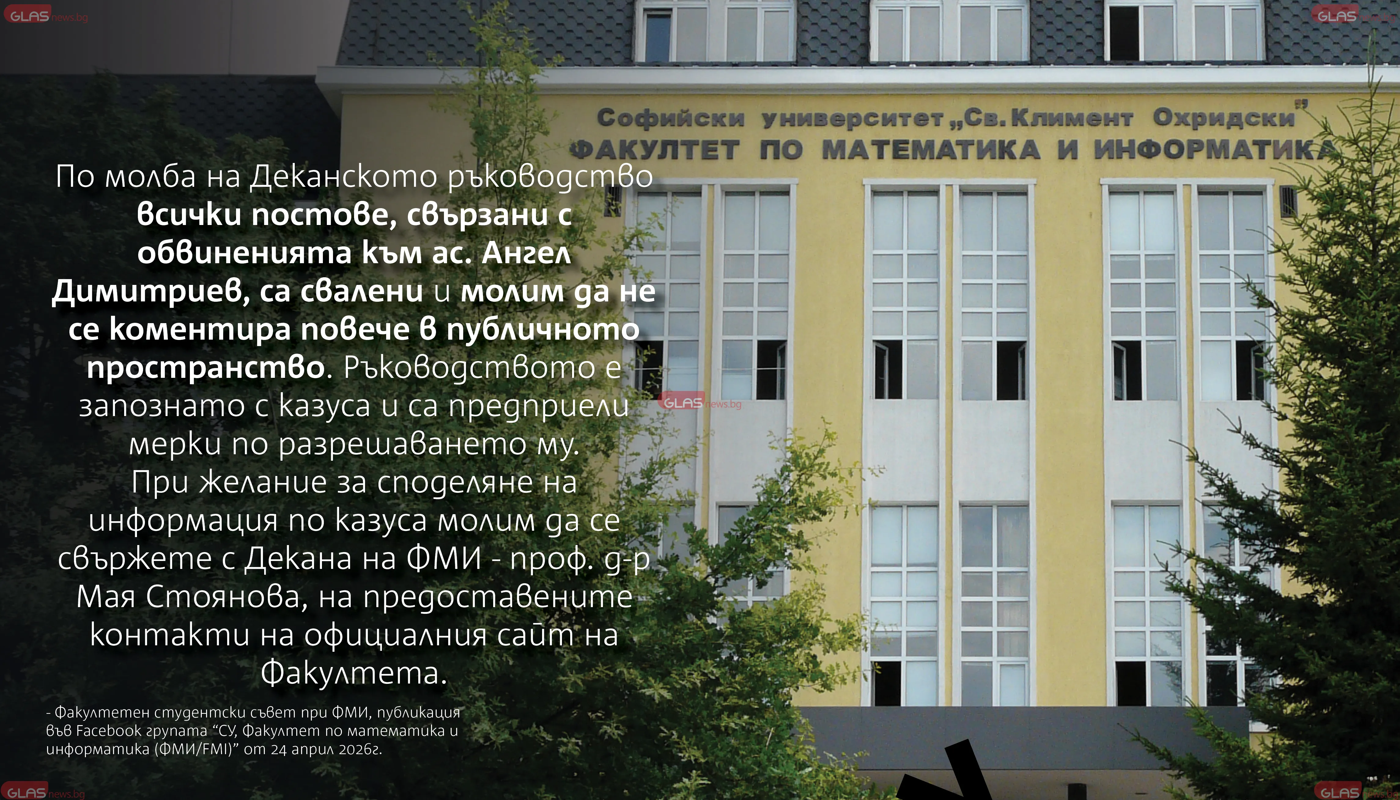 В анонимна публикация се отправи твърдението, че асистентът по "Компютърна информатика" към ФМИ Ангел Димитриев "подтиква студентки да спят с него", използвайки и манипулирайки момичетата с властта си, за да си вземат дисциплината, по която преподава.