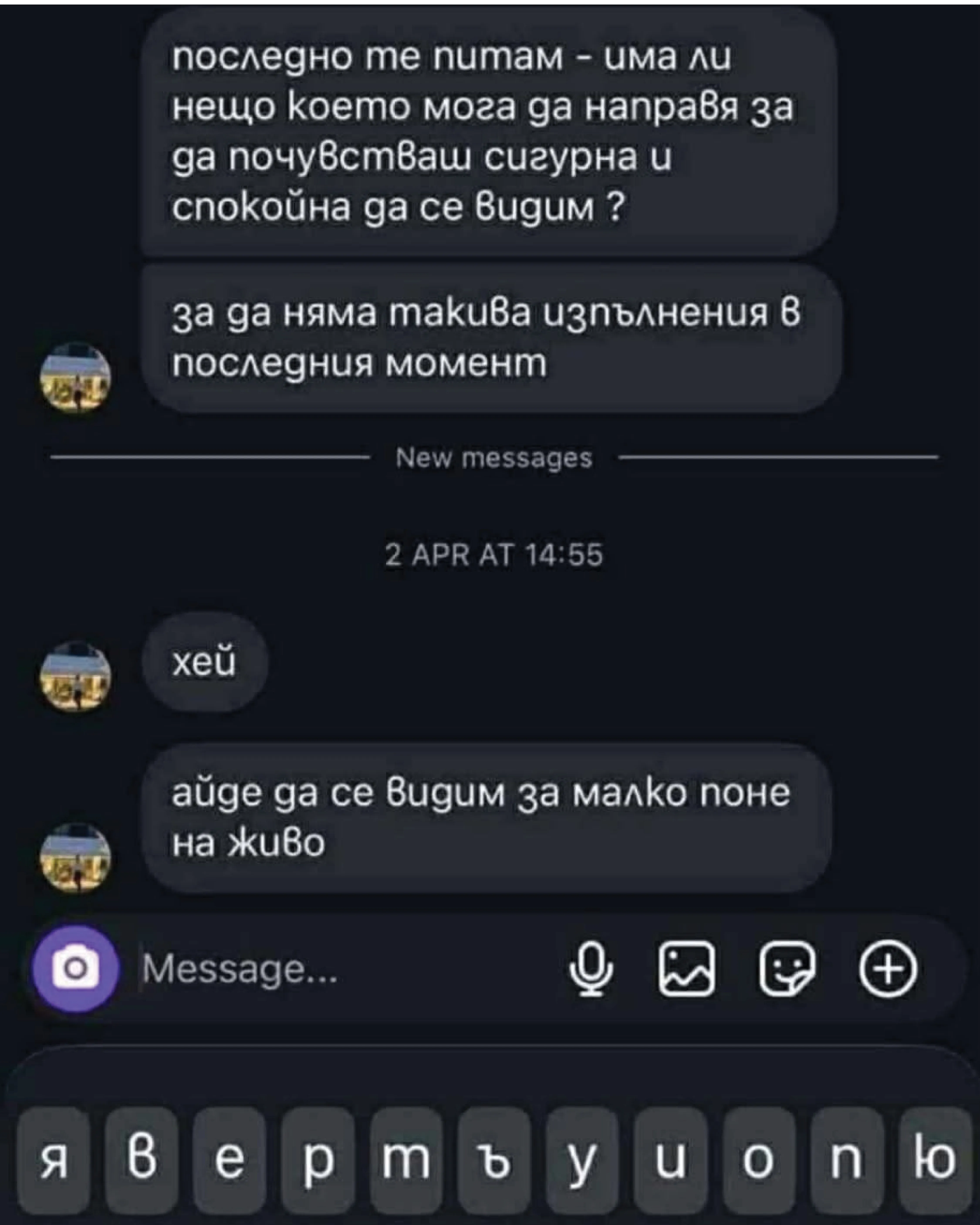В друг чат се пише: "последно те питам - има ли нещо което мога да направя за да почувстваш сигурна и спокойна да се видим? / за да няма такива изпълнения в последния момент"... "хей / айде да се видим за малко поне на живо".