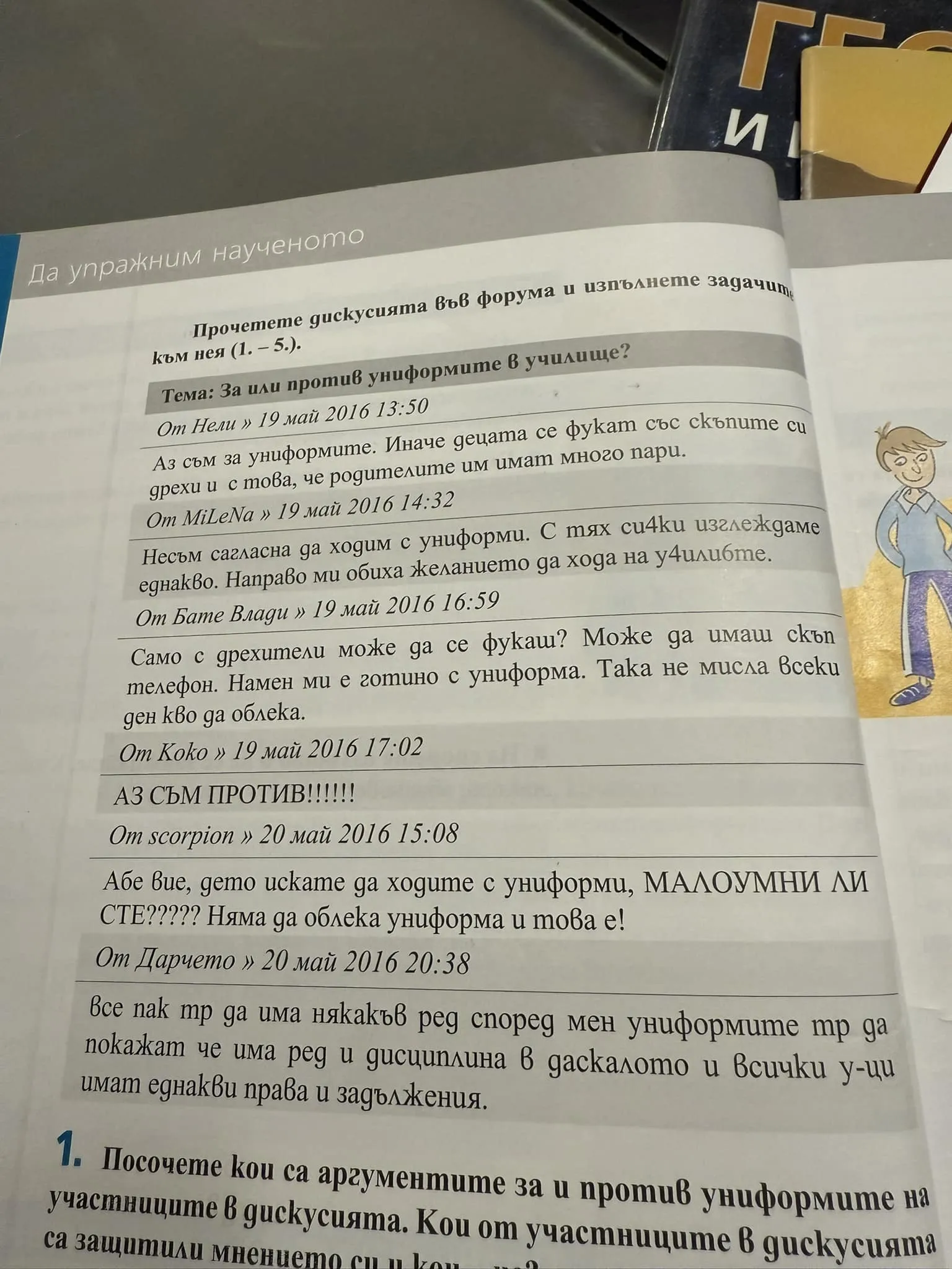 В упражнението „Да упражним наученото“ учениците трябва да прочетат форумна дискусия със заглавие „За или против униформите в училище?“ – пълна с правописни грешки, разговорен жаргон и… доста цветисти изрази. След това да „изпълнят задачите към нея“.