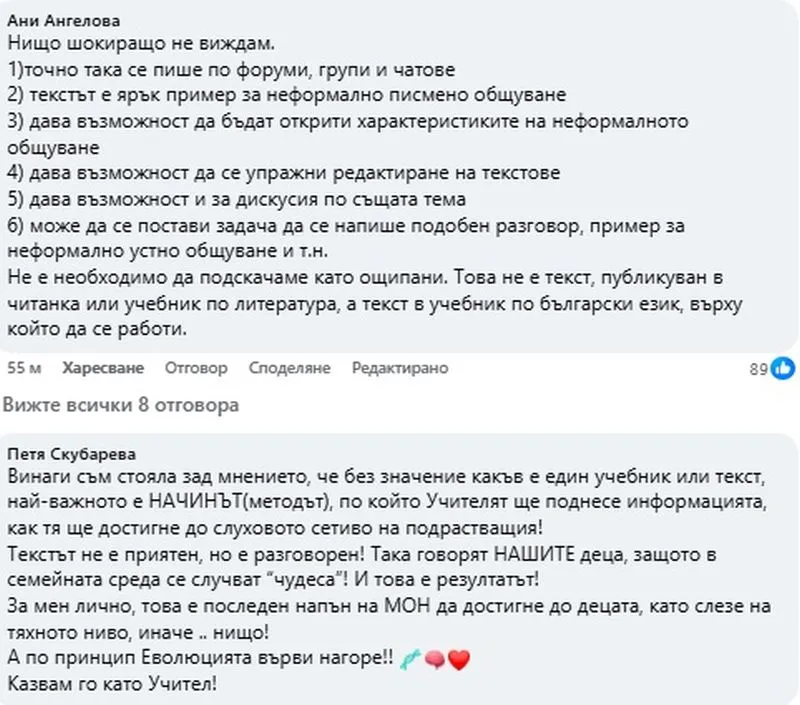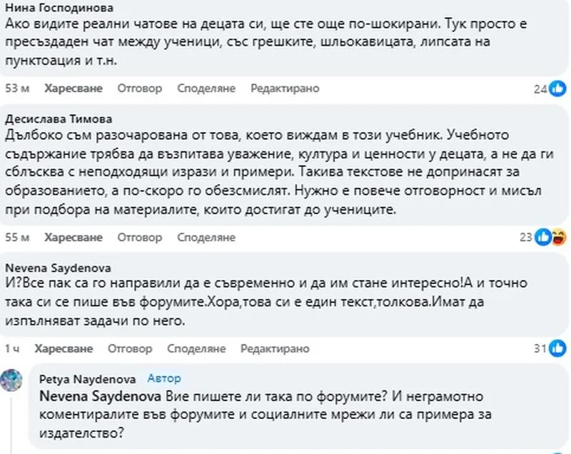 „Учебното съдържание трябва да възпитава уважение и култура, а не да ги сблъсква с неподходящи примери. Такива текстове не допринасят за образованието, а го обезсмислят.“