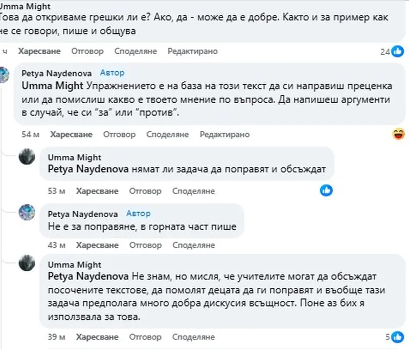 „Точно така се пише по форуми, групи и чатове. Това е чудесна възможност да се анализира неформалното общуване и да се упражни редактиране на текстове.“