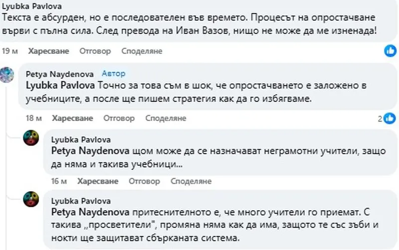 „Процесът на опростачване върви с пълна сила! След превода на Вазов нищо не може да ме изненада“, написа Любка Павлова.