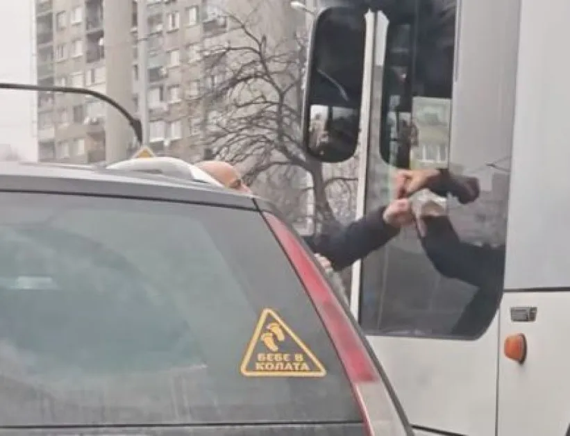 На видео, разпространено от Цветомир Митев във Facebook, се вижда как водач се опитва да се разправи с шофьор от градския транспорт.