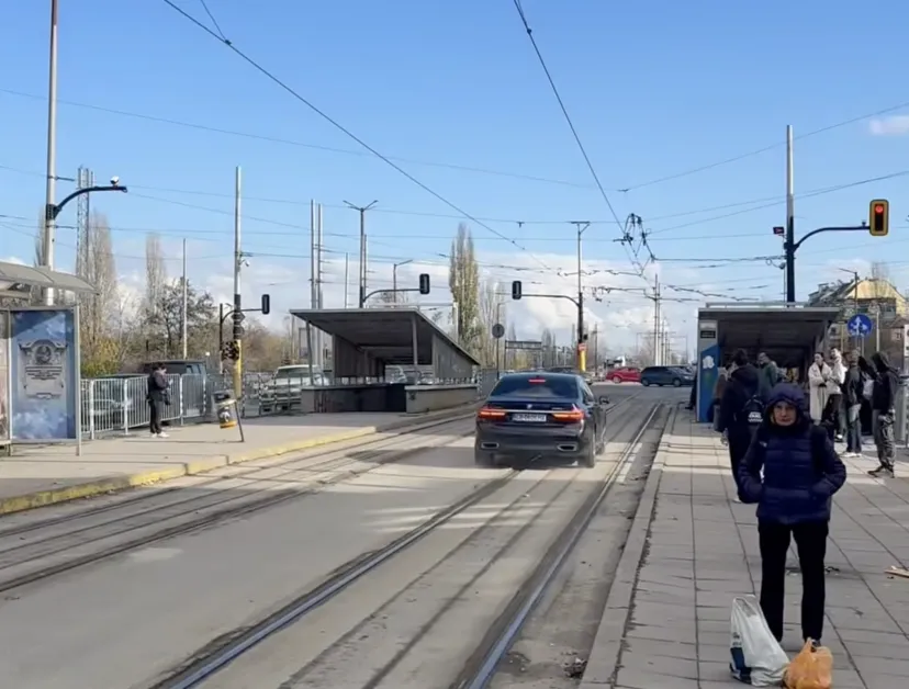 На него се вижда как лъскав автомобил с марката "БМВ" минава през трамвайните релси, за да може да избегне дългата опашка на светофара. След това се вижда как автомобилът прави обратен завой.