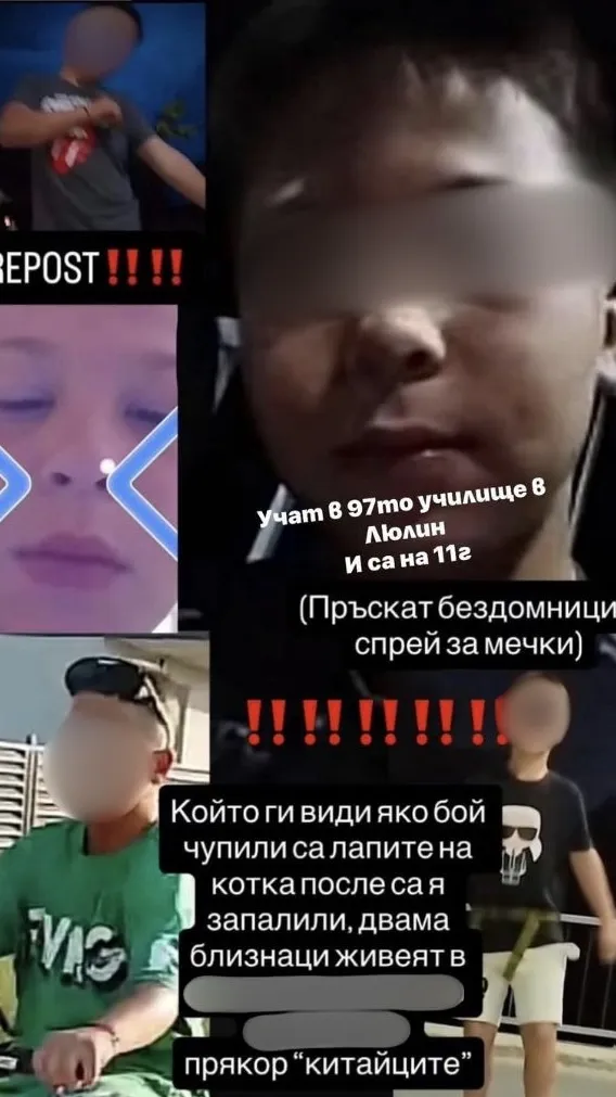 Споделяме видеото, разпространено от едно от децата. На него се чува как детето зад камерата казва, че това им е тайната база. Ще споделим и въпросния колаж със снимки на децата, участвали в грозния акт, но ще закрием лицата им и адреса на двамата близнаци.
