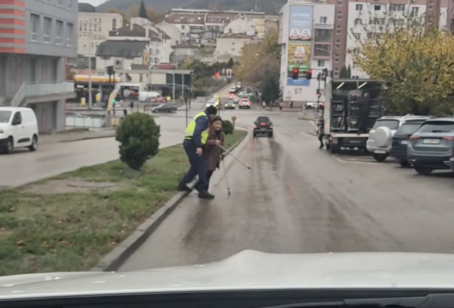 Видеото, споделено в местна група във Facebook - показва как униформен помага за възрастната жена да пресече като я държа и спира движението по платното за движение.