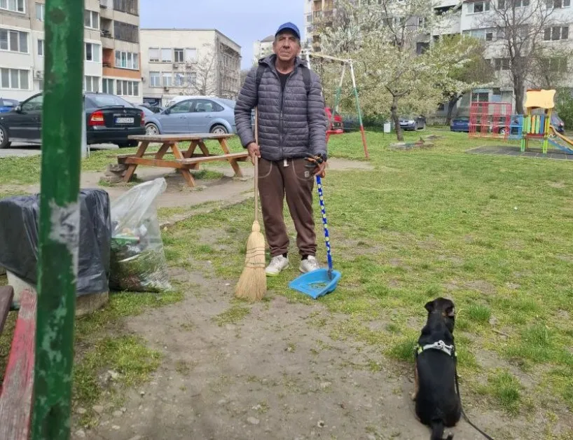 На фона на детска площадка, паркирани автомобили и типичните панелни блокове, този човек се превръща в нещо повече от „чистач“. Той е пример.