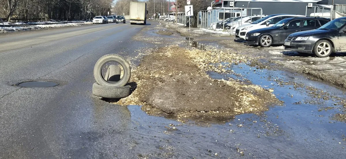 Снимки, разпространени в социалната мрежа Facebook чрез групата „Забелязано в град Плевен“, показват тревожна гледка – разкъсана асфалтова настилка, кал и насип от чакъл върху пътното платно, както и образували се локви. Вместо адекватна сигнализация или обезопасяване на опасния участък, на място са поставени… автомобилни гуми.