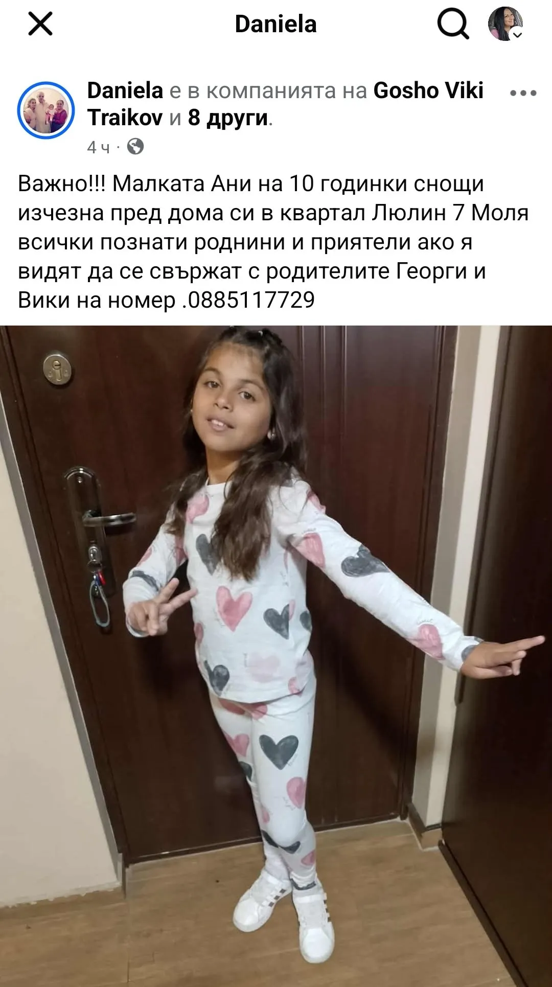 Според информацията в поста, малката Ани е изчезнала снощи пред дома си в квартал „Люлин“ 7.