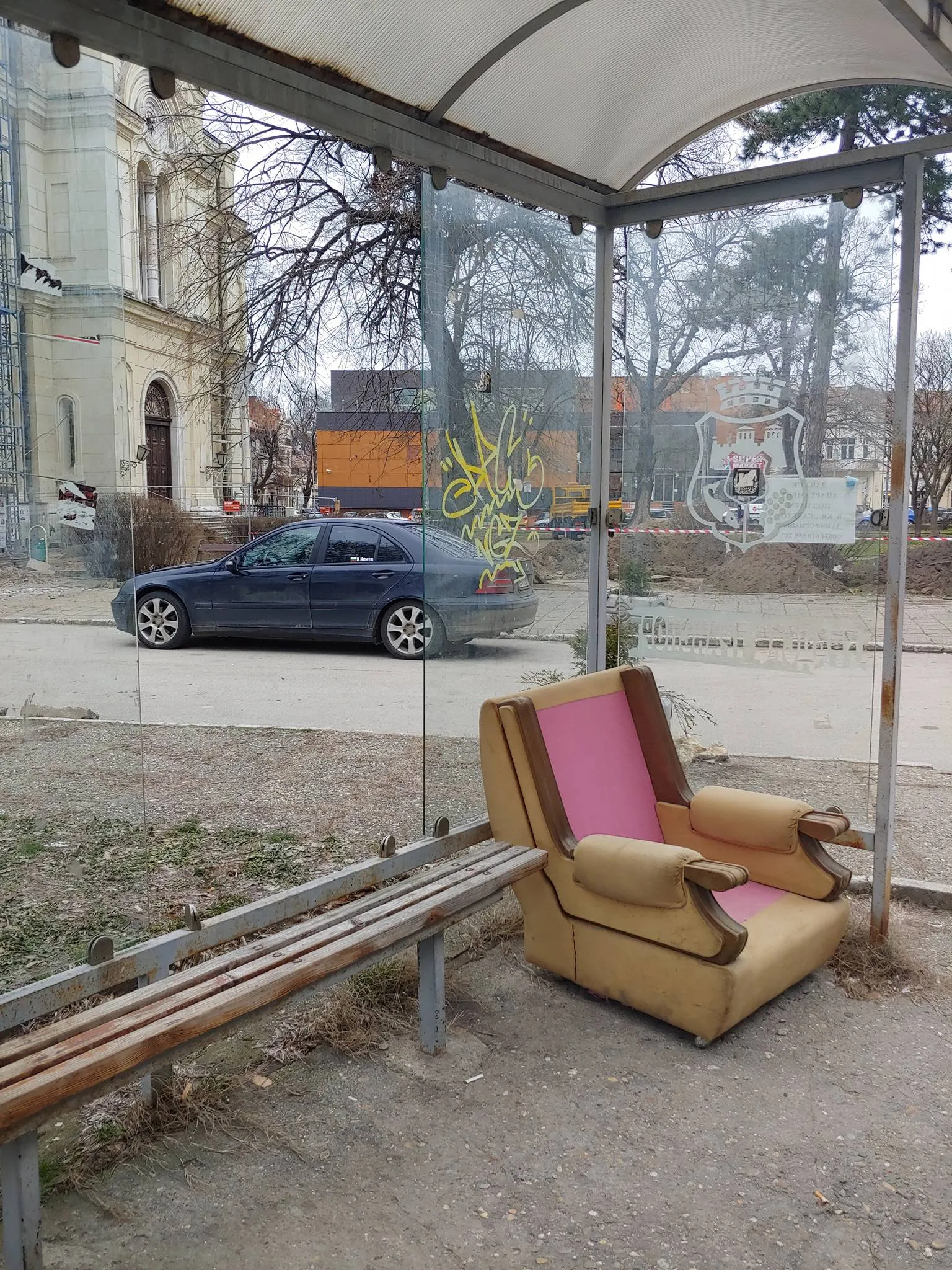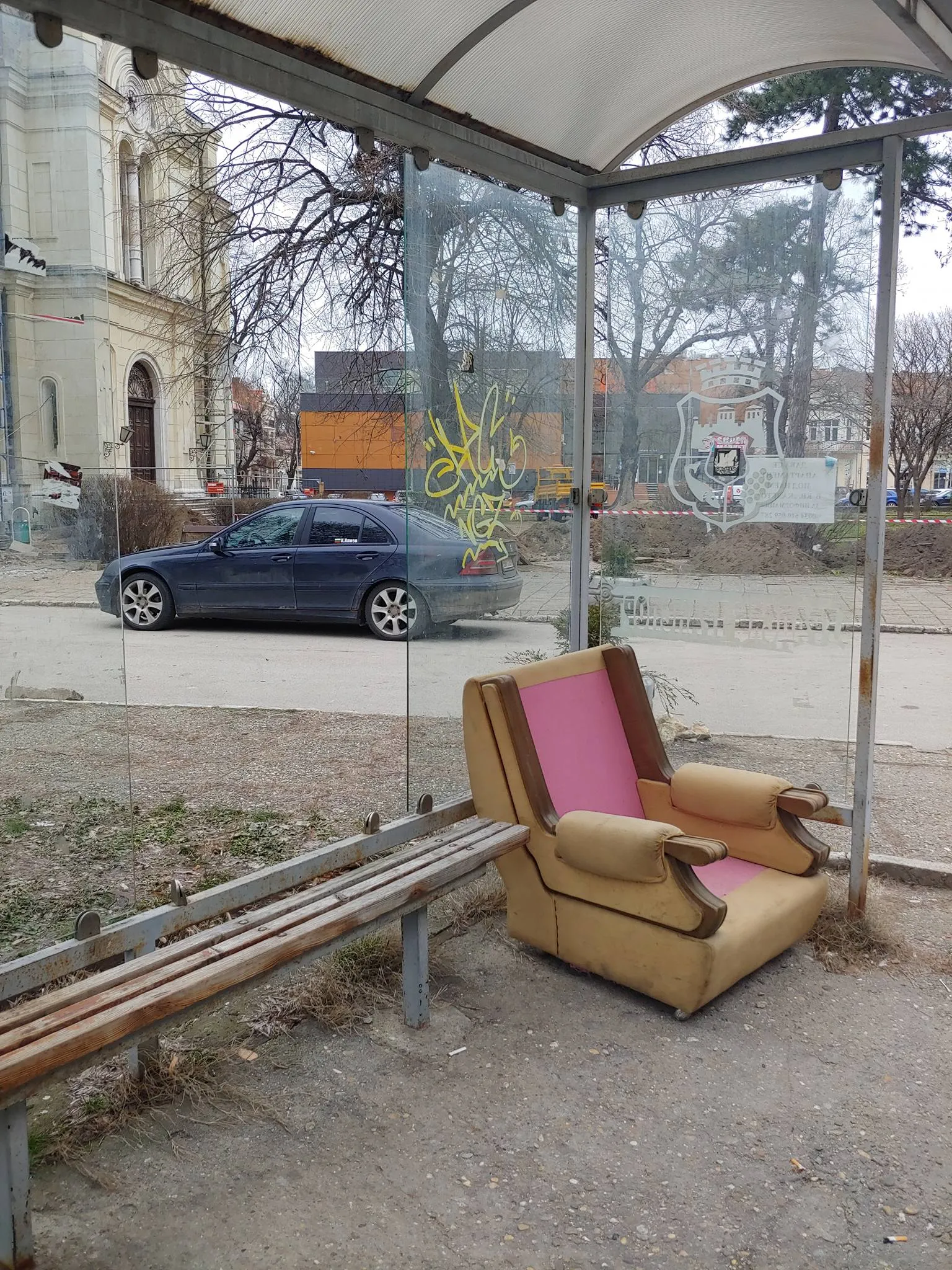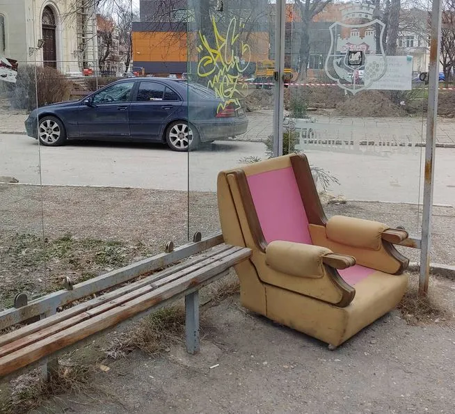 Забравете студените железни пейки, клатещи се дъски и липсващи облегалки – на една от спирките край катедралата „Свети Димитър Солунски“ е възникнал оазис на уюта. Там гордо тронясва старичък, но запазен фотьойл, който очевидно е преминал от категория „мебел за изхвърляне“ към „обществено достояние“.