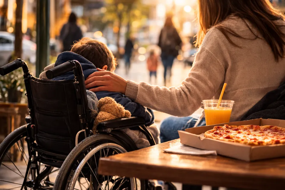Тя поръчва пица за вкъщи и чака, докато бъде приготвена. В този момент семейство, което тъкмо излиза от пицарията, прави нещо напълно неочаквано – плаща сметката ѝ.