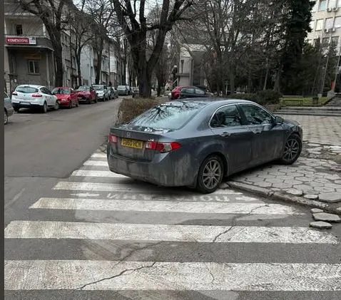 Машината е разположена напреки на „зебра“, като майсторът зад волана е успял да я качи и на тротоара.