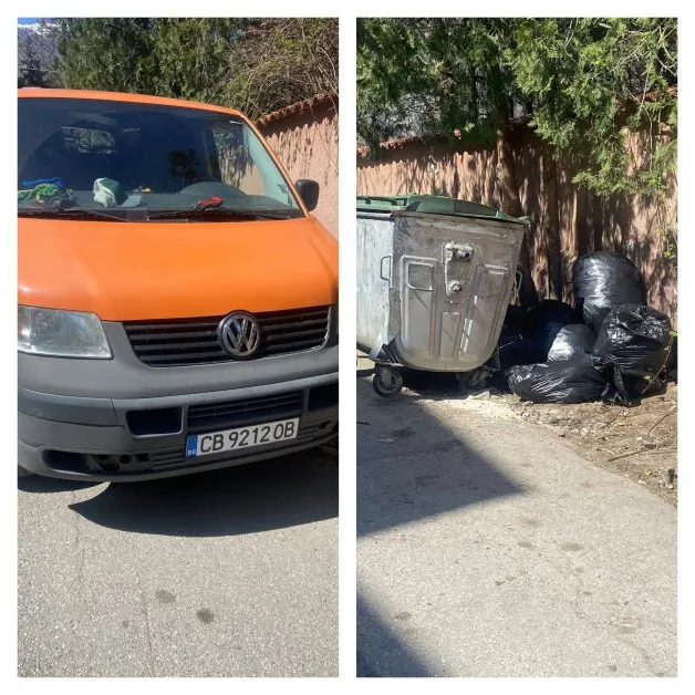 На снимките се вижда оранжев микробус, от който по думите на очевидеца двама души разтоварват чували с отпадъци. Част от тях дори не се побират в контейнерите и остават струпани до тях – класическа гледка, която превръща иначе поддържан район в… сметище.