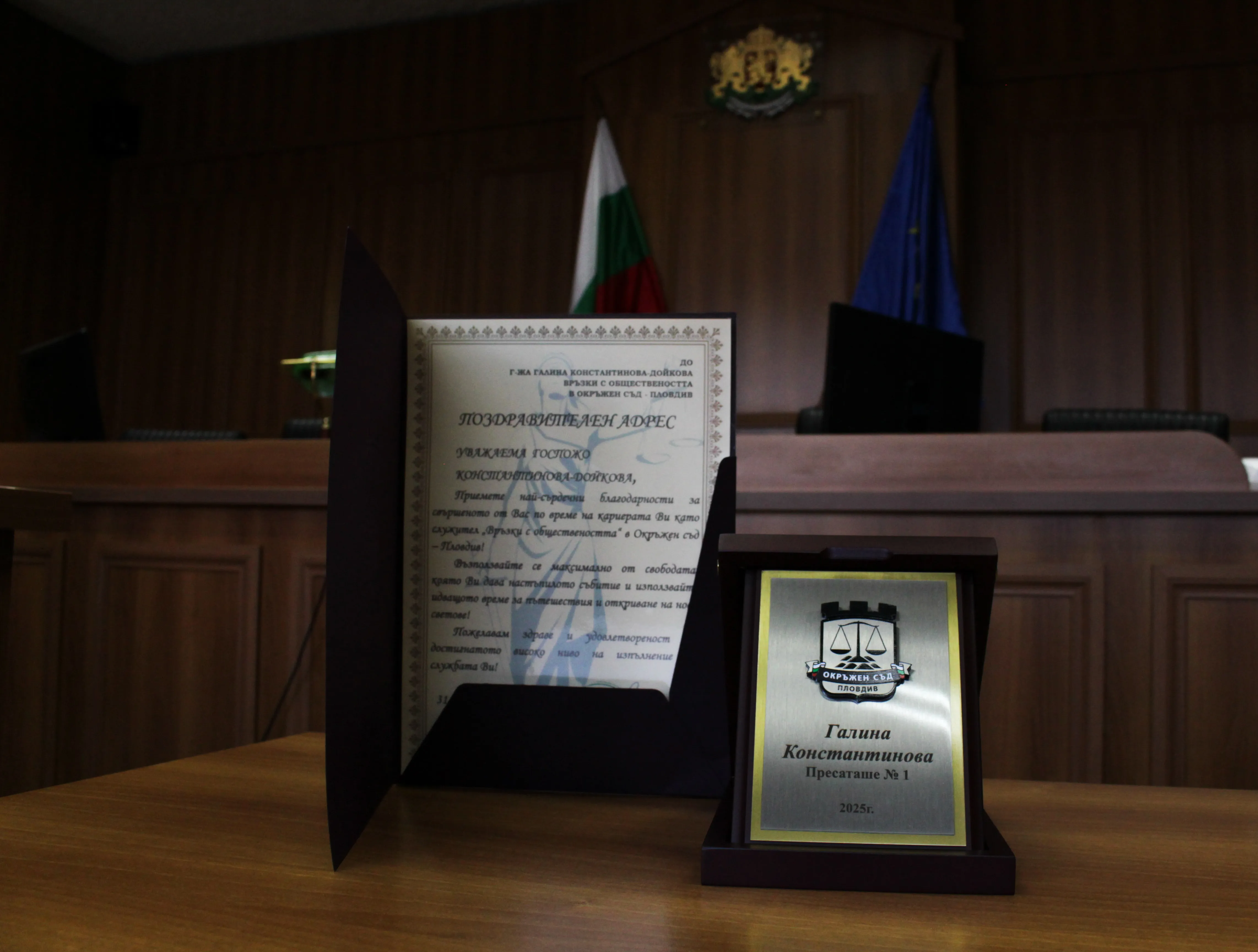 В присъствието на представители на местните медии г-жа Розалия Шейтанова – и.ф. председател на Окръжен съд – Пловдив връчи на г-жа Галина Константинова Почетен плакет на Окръжен съд - Пловдив „Пресаташе № 1“ и грамота за проявения висок професионализъм и отговорно изпълнение на служебните задължения, като ѝ отправи пожелания за здраве, дълголетие и спокойствие.