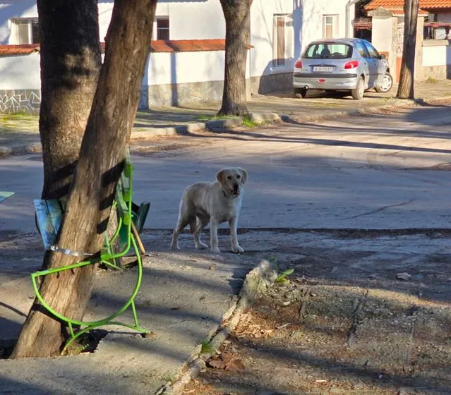 „От днес бездомен, ще търси дом! Спира кола днес в центъра на селото, посред бял ден. Изхвърлят кучето от багажника и си отиват. То стои там и лае… Може би се страхува /споделено от очевидци/ .