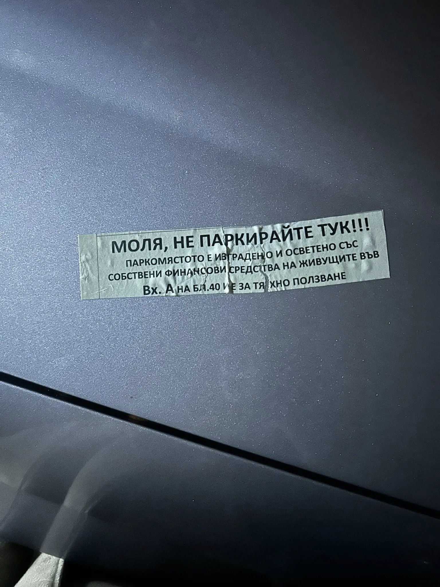 Здравейте, исках само да попитам дали беше нужно, които е решил да го направи, да счупи задната ми чистачка, защото съм спряла пред блок, където няма нито знак, нито разграфени паркоместа, нито нищо? А нека вметна, че живея точно до този въпросен блок, и от повече от 2 месеца си паркирам там без проблем, за да се натъкна днес на тази “приятна” изненада с бележки, пъхнати под предните ми чистачки, и счупена задна? На бележката пише, че осветлението и всичко идва от живущите там, разбирам, но никъде няма знак, как се очаква някой да го знае? Аз съм студентка, от регистрацията ми става ясно, мястото, което наемам не разполага с паркомясто, следователно си търся такова. Винаги съм внимавала да не преча, да не запушвам, да не е гараж и какво ли още не. Знам, че масово сме в тази ситуация с местата, но това е леко прекалено според мен, като се има предвид, че това вече е и рушене на чужда собственост.