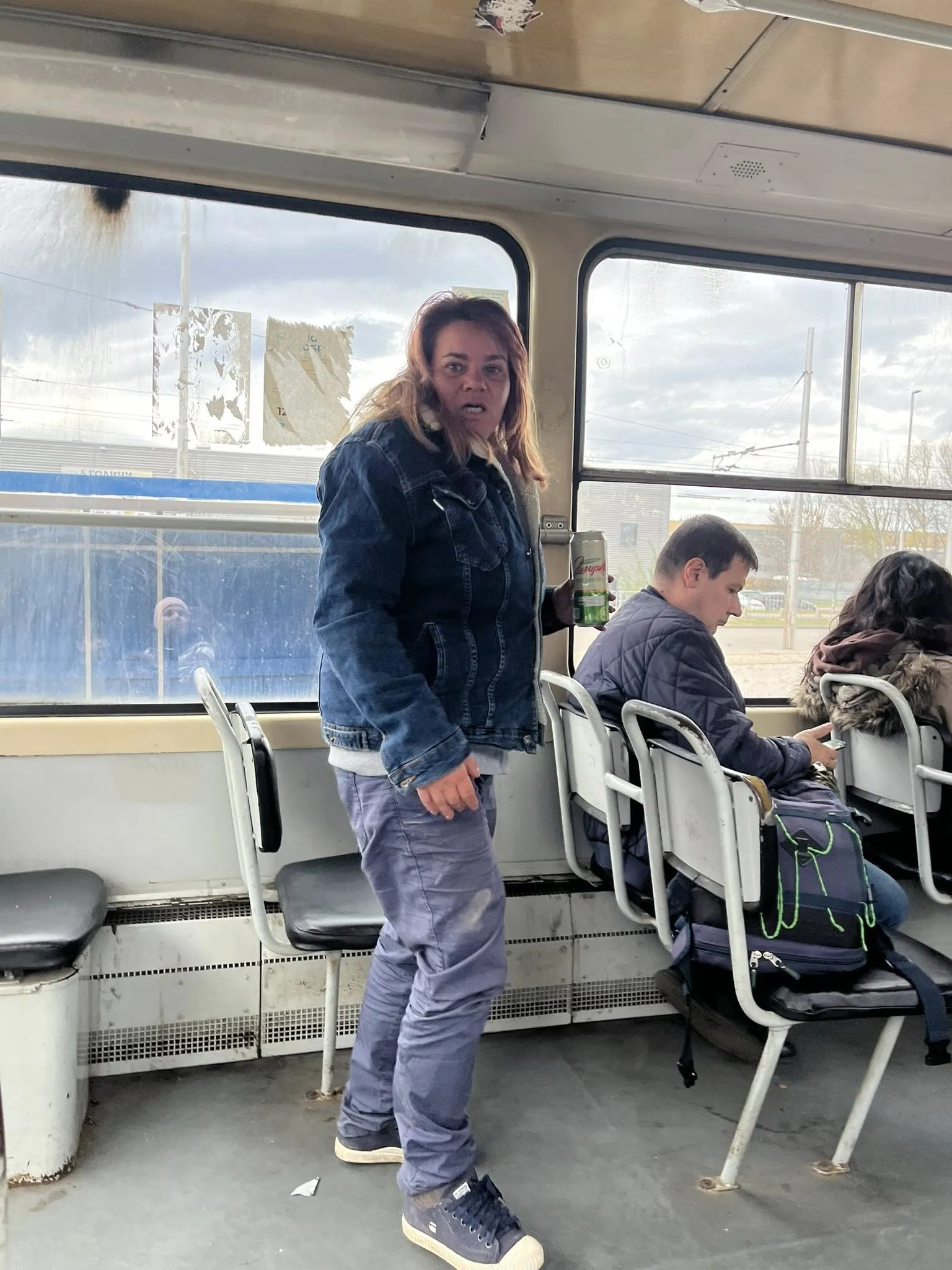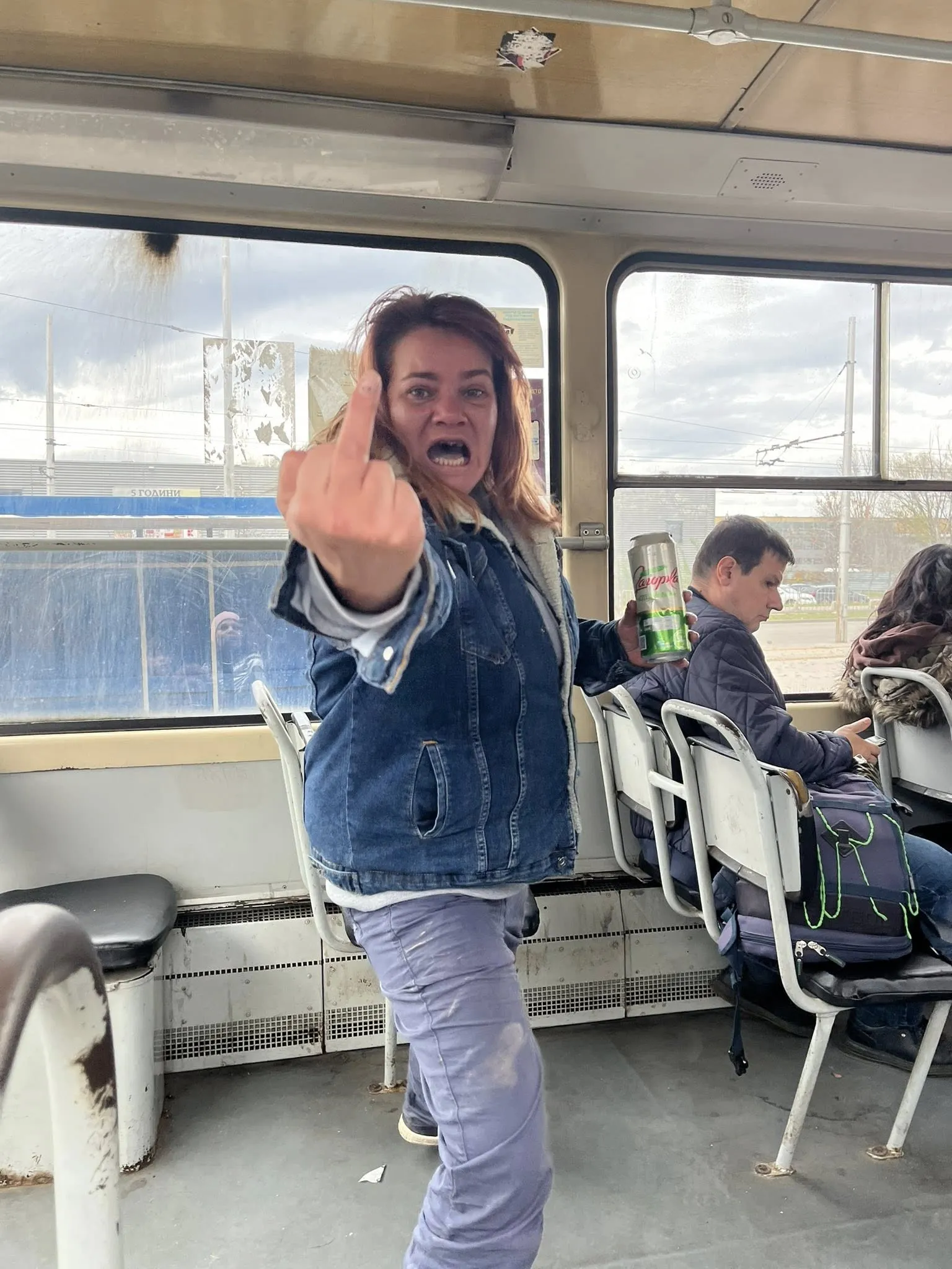 Василева сподели и снимки на въпросната жена от трамвая. На два от кадрите се вижда как жената държи кенче с бира в едната ръка, а с другата показва среден пръст към детето.