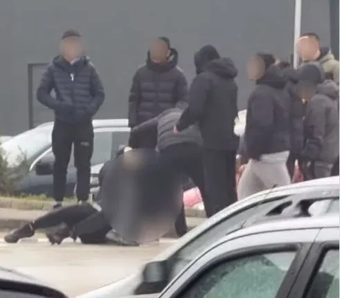 Тийнейджъри се сбиха посред бял ден край голям хипермаркет, а по време на жестоката размяна на удари тумба техни връстници наблюдава с ръце в джобовете.