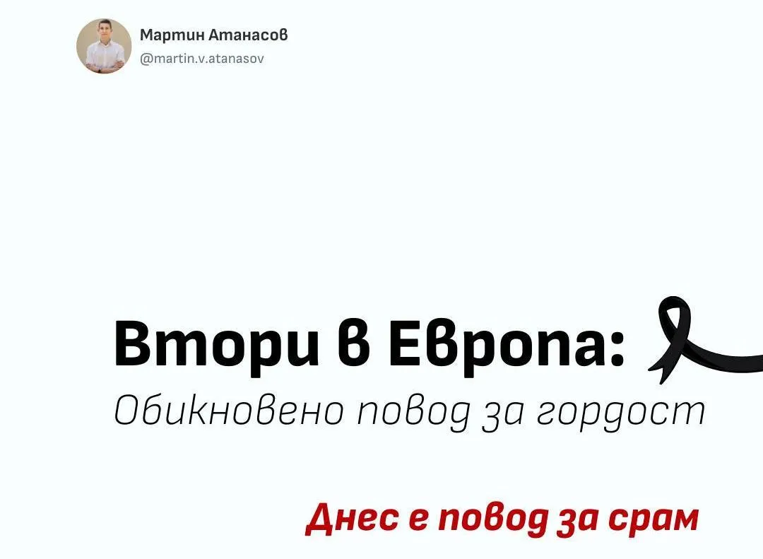 „Втори в Европа. Обикновено това е повод за гордост, но това не е публикация за успех на Олимпиадата. Днес е повод за срам“, написа Мартин в социалните мрежи.