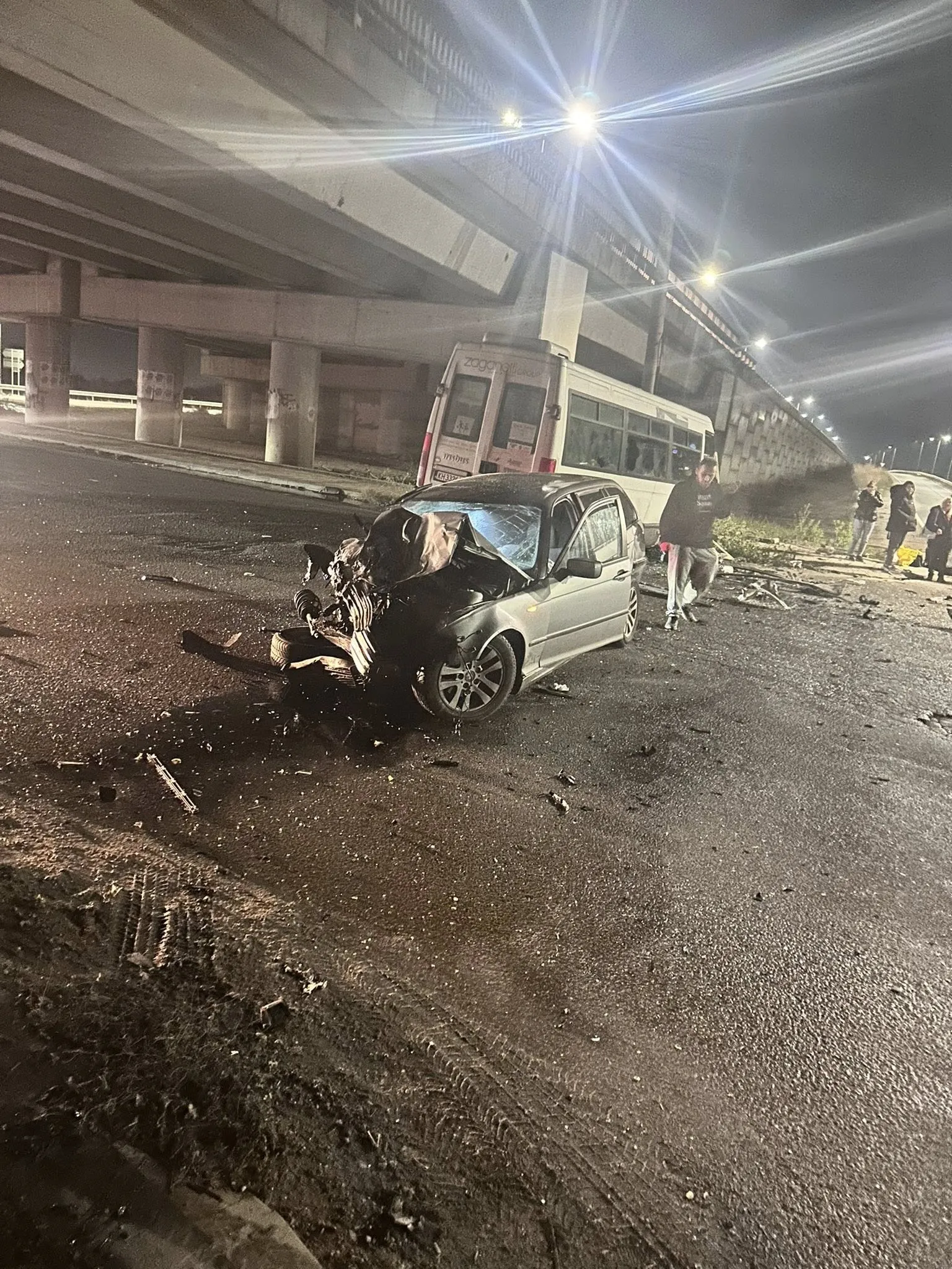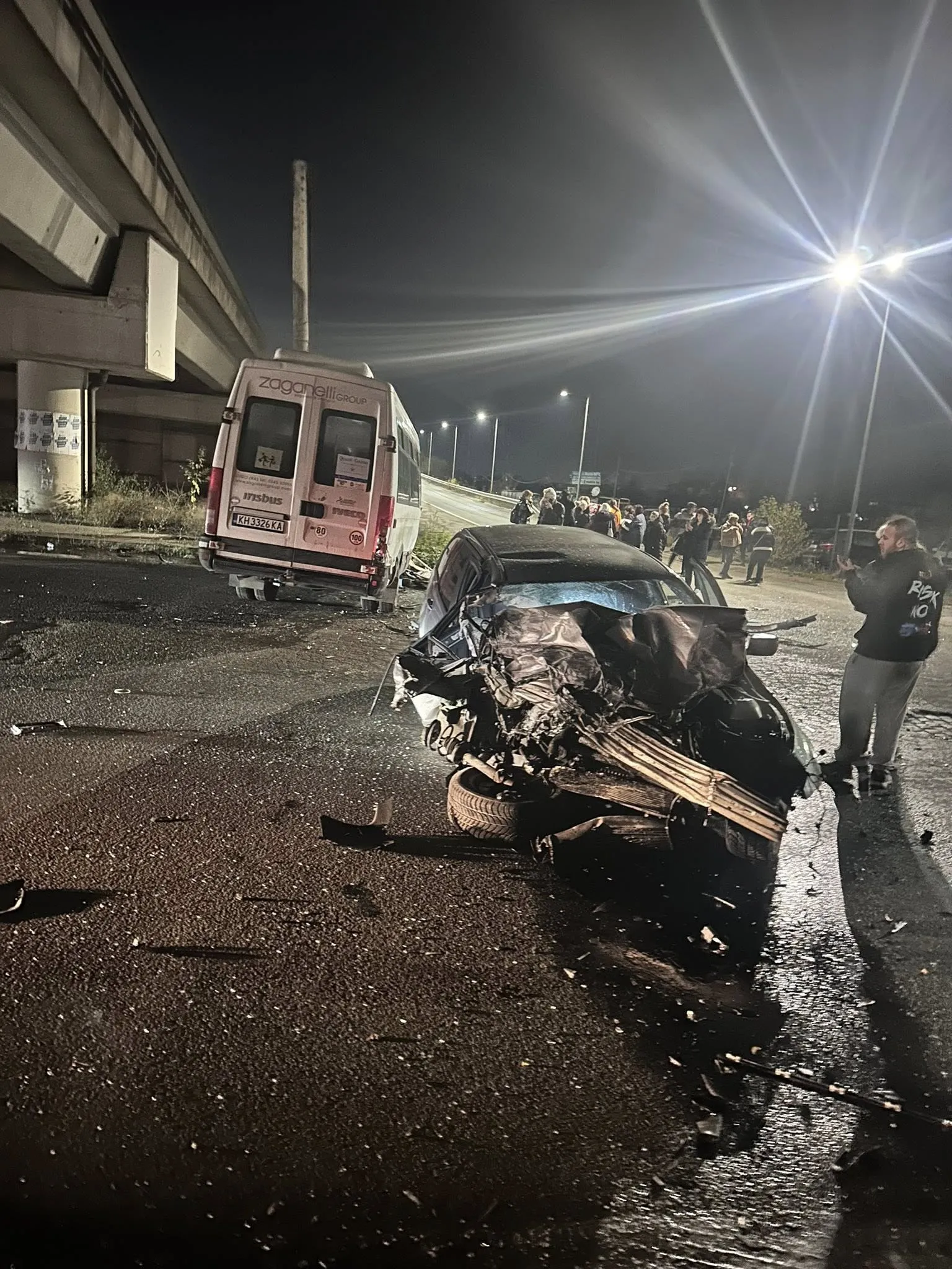 Зверска катастрофа разтърси тази нощ района на Чепинско шосе и Северната скоростна тангента. Силният сблъсък между лек автомобил и пътнически бус превърна мястото в поле от разкъсани ламарини, стъкла и разхвърляни части – картина, която шокира десетките събрали се очевидци.