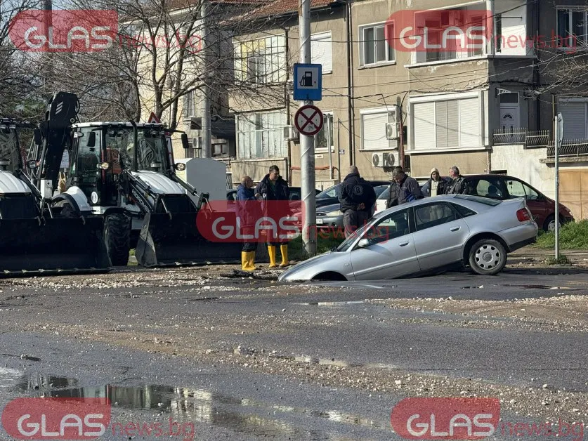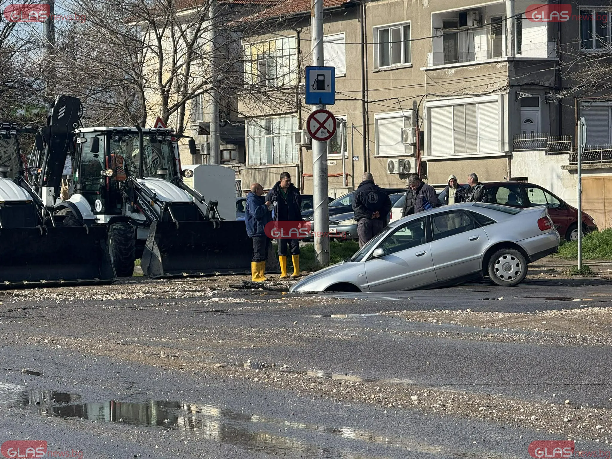 - 10:26 Ауди пропадна в огромен кратер в Пловдив, улица се превърна в река СНИМКИ