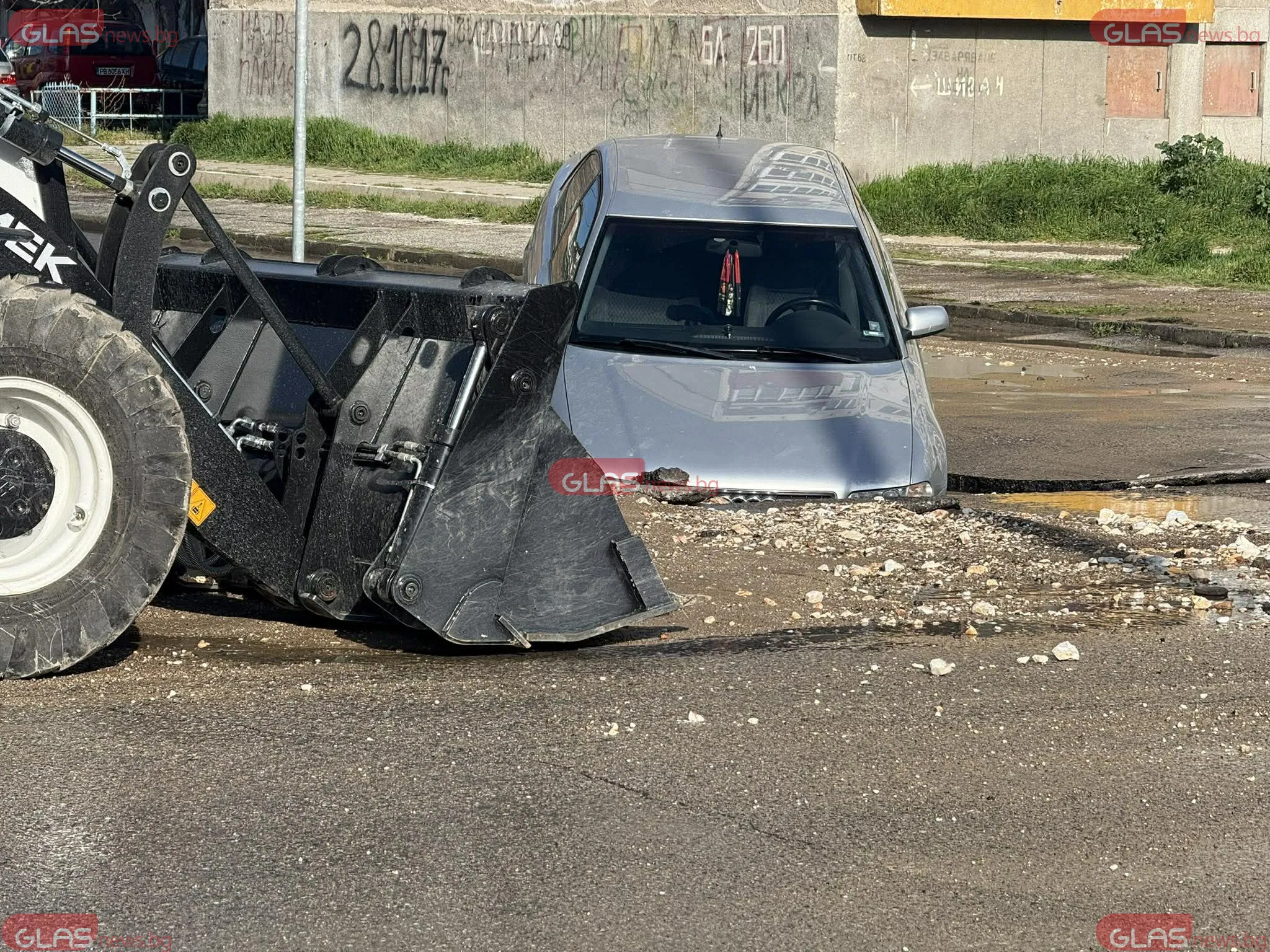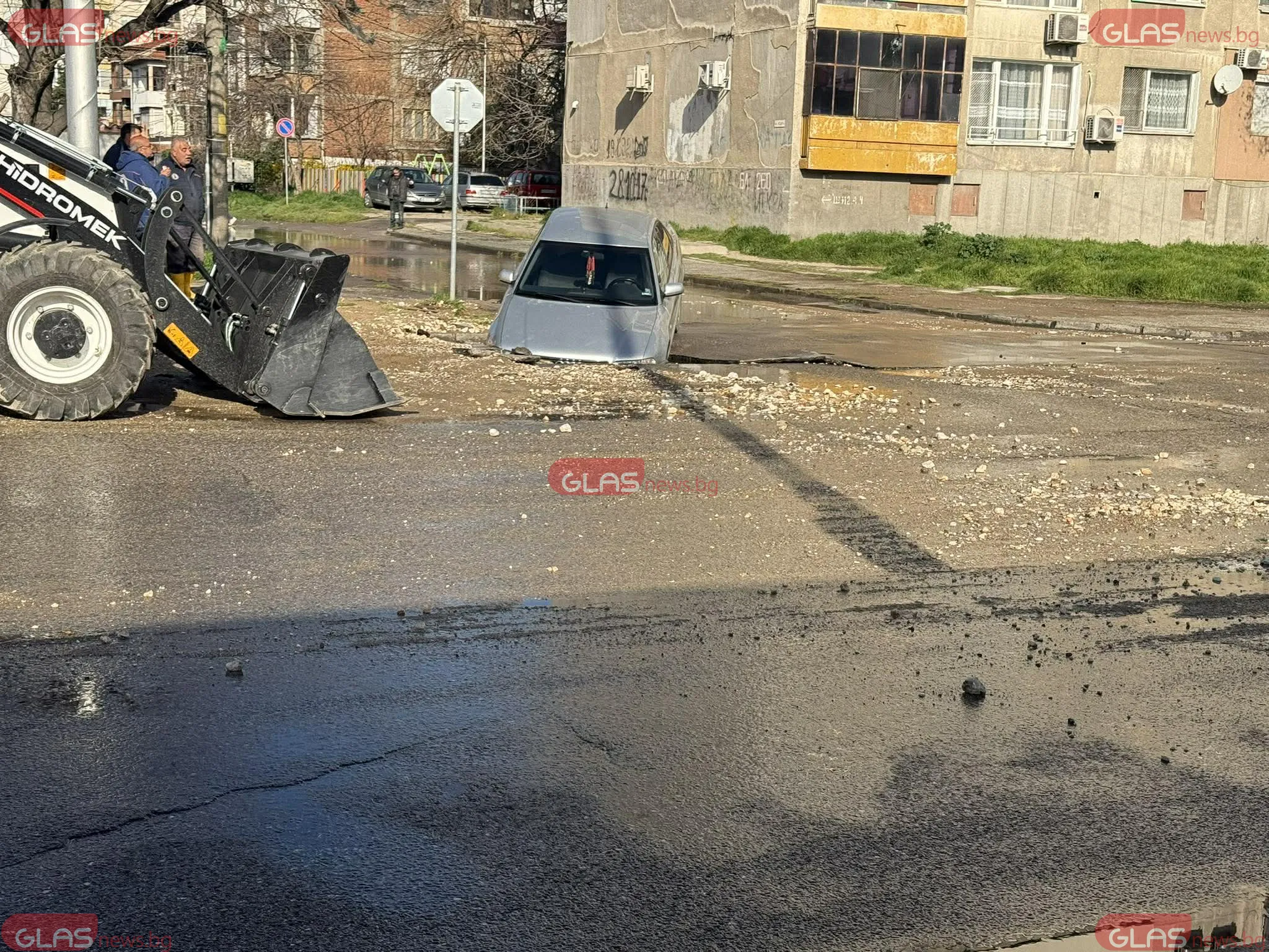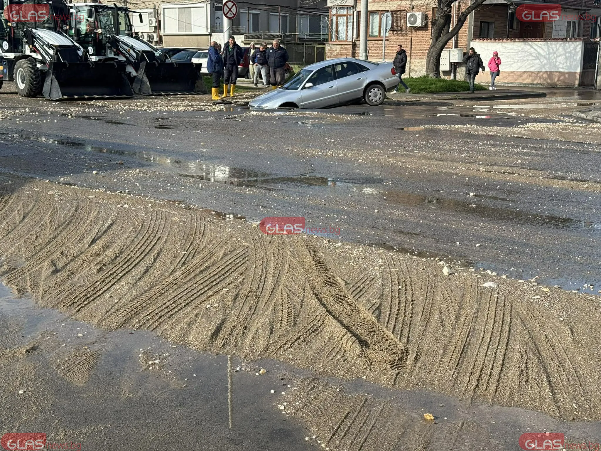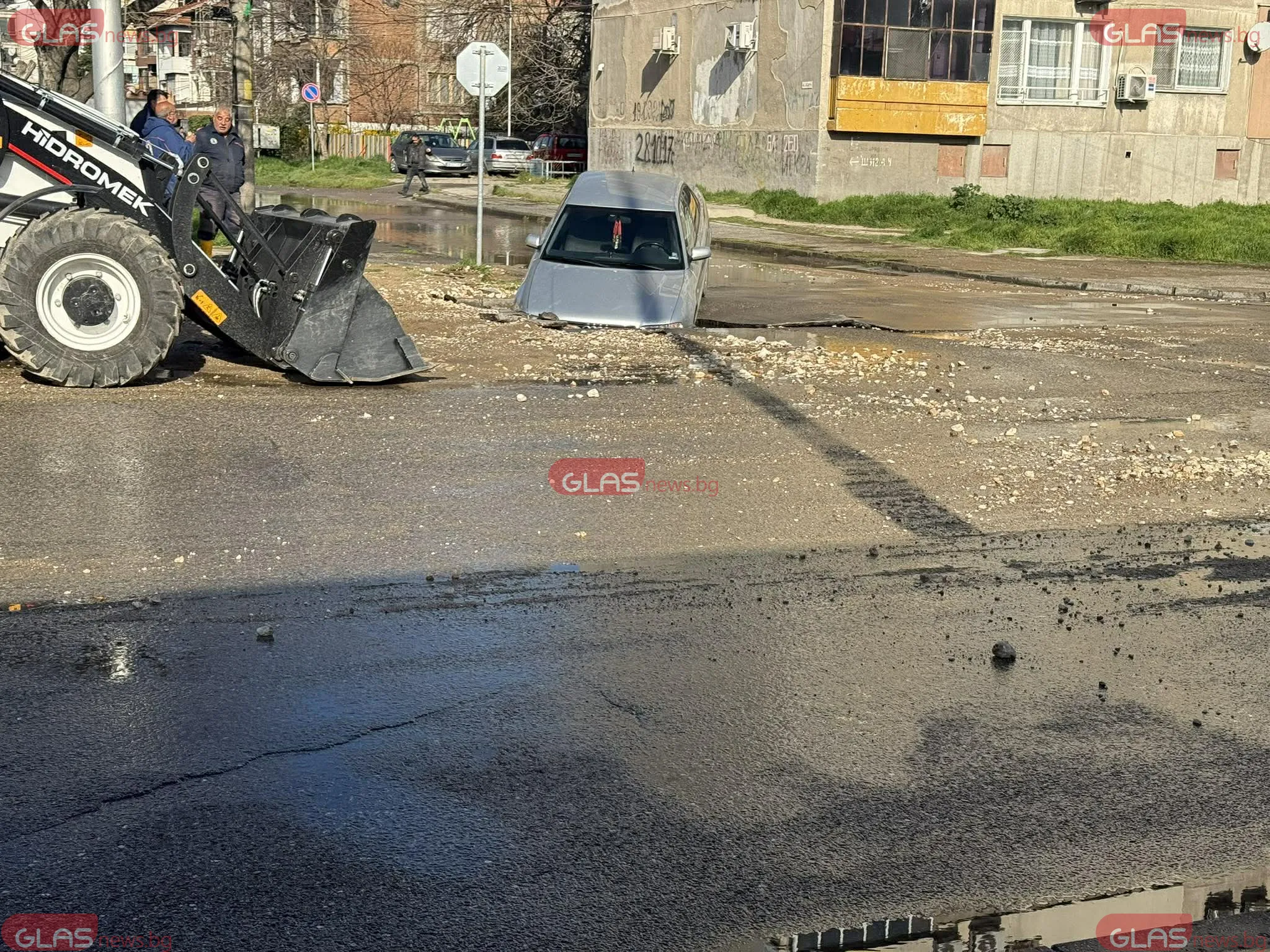 Огромна ВиК авария наводни ул. "Ландос" в кв. "Изгрев". Кола е пропаднала в огромна дупка, отворила се при пропадането на асфалта заради аварията.