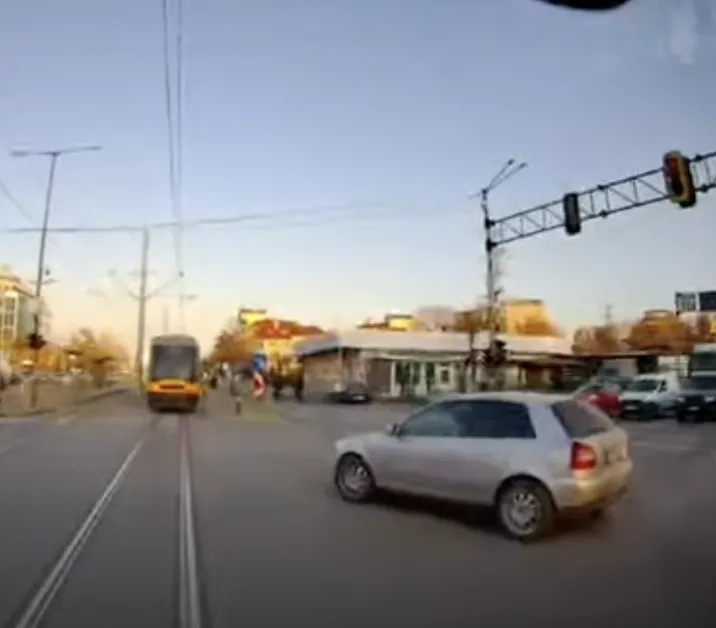 Видео, публикувано във Facebook, показва как лек автомобил "Ауди" се удря в трамвай в София.