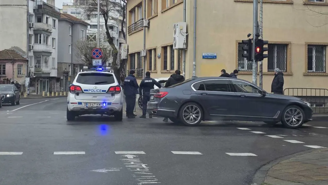 БМВ-то седи спряно на аварийни светлини в кръстовището, което затруднява леко трафика в посока подземната улица. Лексусът пък е с разбита предници и седи качен на тротоара.