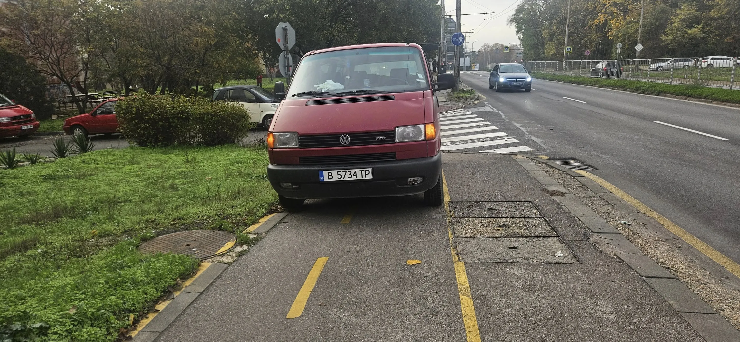 На кадрите се вижда как червен микробус Volkswagen е спрял изцяло върху маркираната велоалея, която е част от новата велосипедна инфраструктура в района. Така превозното средство напълно блокира преминаването на колоездачи и пешеходци.