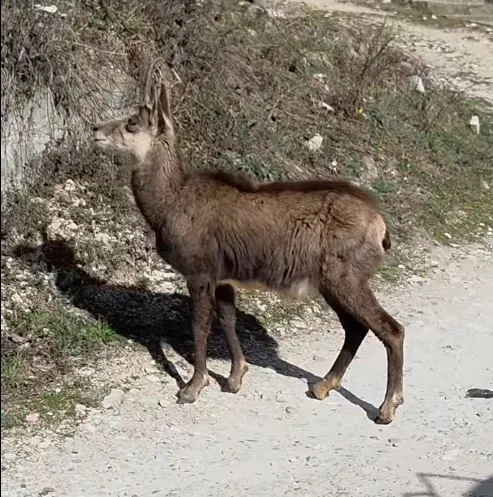 Животното пък не се стряска от близката среща, като спокойно продължава занятието си. Не след дълго обаче все пак решава да се поотдалечи, с интерес оглежда склона и пъргаво изкачва стръмнината към гората – за завист на всеки турист, отдалечавайки се от жилищните сгради.