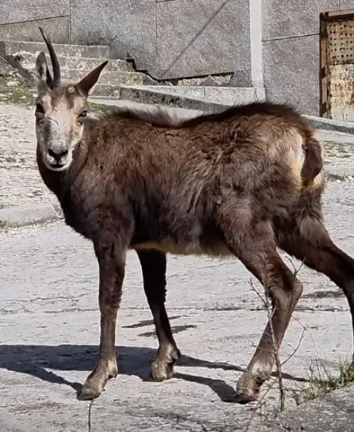 Животното пък не се стряска от близката среща, като спокойно продължава занятието си. Не след дълго обаче все пак решава да се поотдалечи, с интерес оглежда склона и пъргаво изкачва стръмнината към гората – за завист на всеки турист, отдалечавайки се от жилищните сгради.