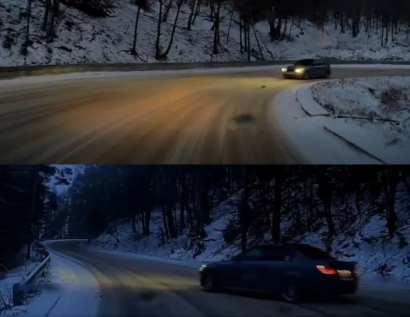 Поведението на автомобилиста създава подозрения у някои потребители, че водачът прави опити за дрифт по снежните завои на прохода.