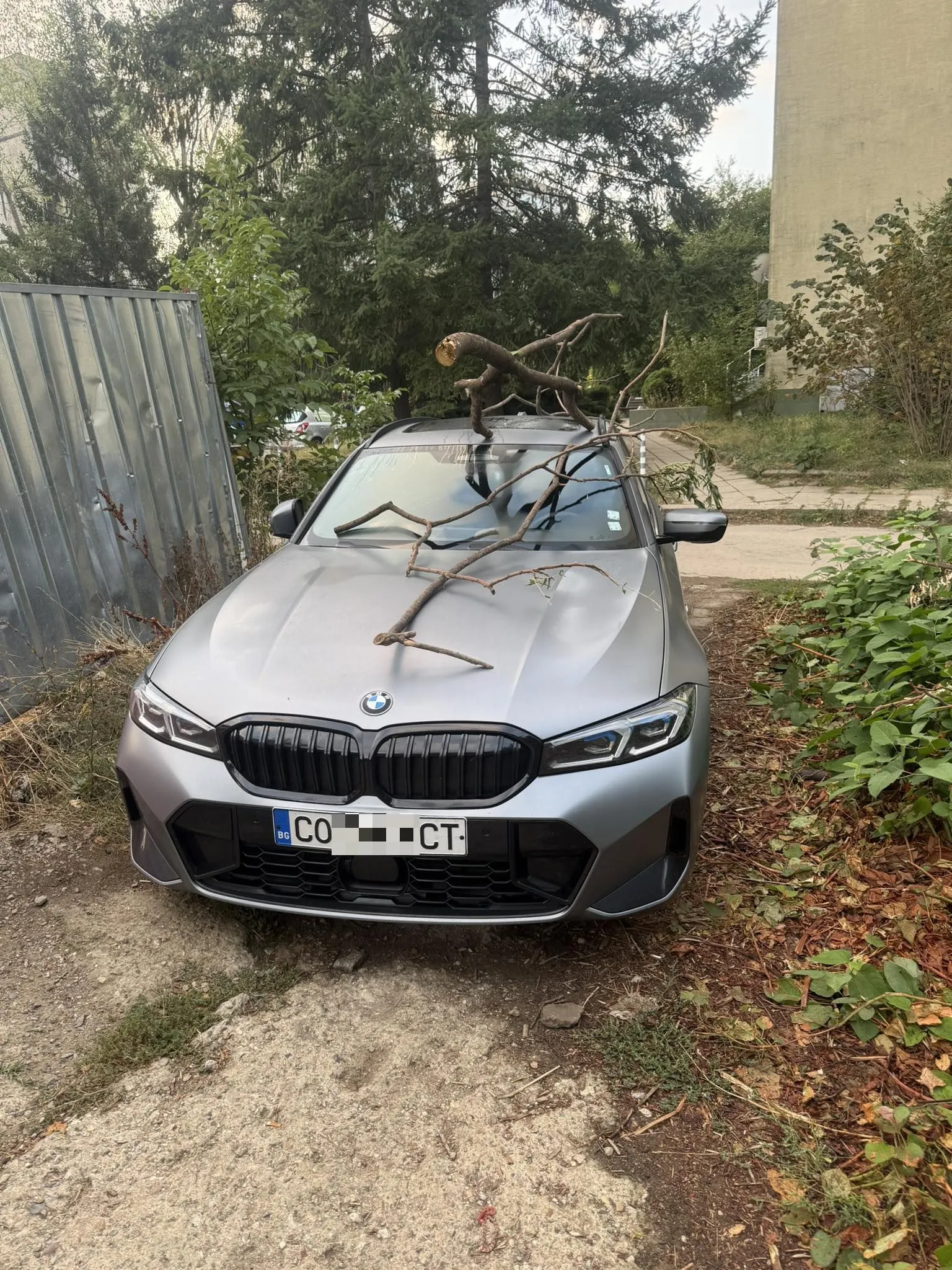 Паркиран автомобил в столичния квартал „Студентски град“ предизвика вълна от коментари в социалните мрежи, след като върху него бе поставен голям клон. Немското возило, паркирано върху пътека между блоковете, очевидно е разгневило жителите на района.