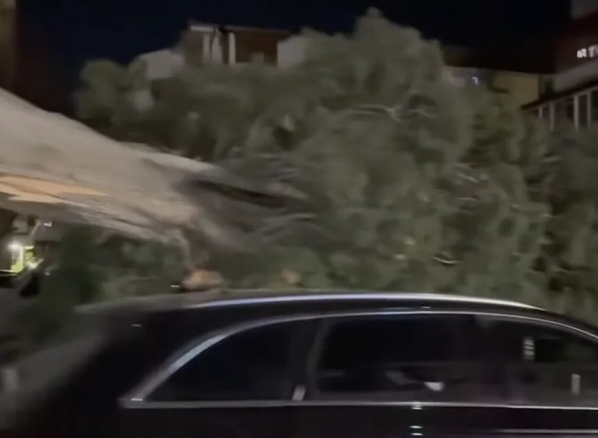 Това показва видео, споделено в социалните мрежи. То показва как голямо дърво е паднало върху няколко автомобила.