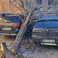 Продължават силните ветрове и тази вечер. В Стара Загора огромно дърво се стовари върху пълен с автомобили междублокове паркинг.