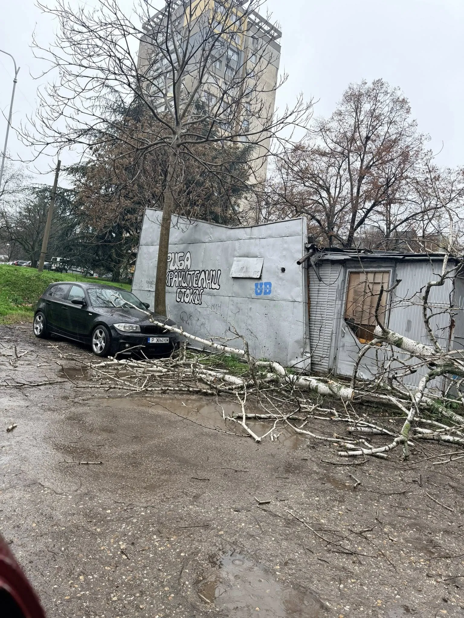 Жители на русенския квартал „Здравец“ сигнализираха тази сутрин за паднало дърво върху паркирани автомобили зад блок 84. Силният вятър и мократа земя вероятно са довели до пречупването на дървото, което е паднало върху няколко коли в непосредствена близост до гаражите.