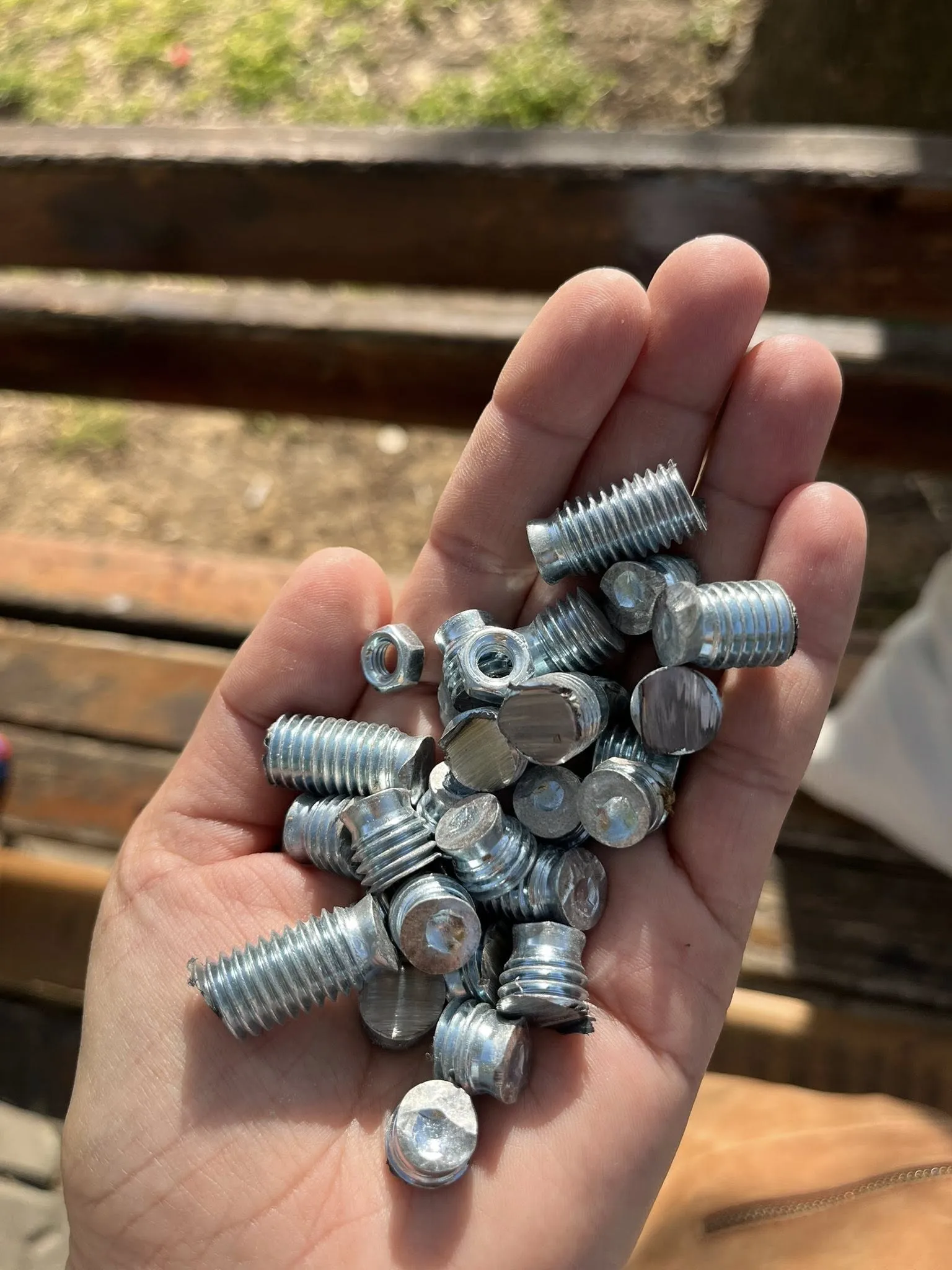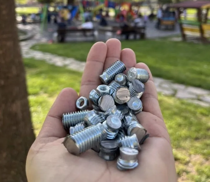 Снимките показват шепи с остри метални парчета – малки, но достатъчни да причинят сериозни наранявания. И то точно там, където децата тичат, падат и играят.