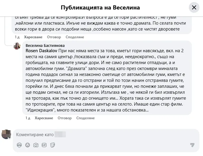 „Драмата започна след сигнал за незаконно сметище от гуми през октомври. Кметът получи предписание да го отстрани и той го прави по този начин - като ги гори“, обяснява тя в секцията с коментари под публикацията.
