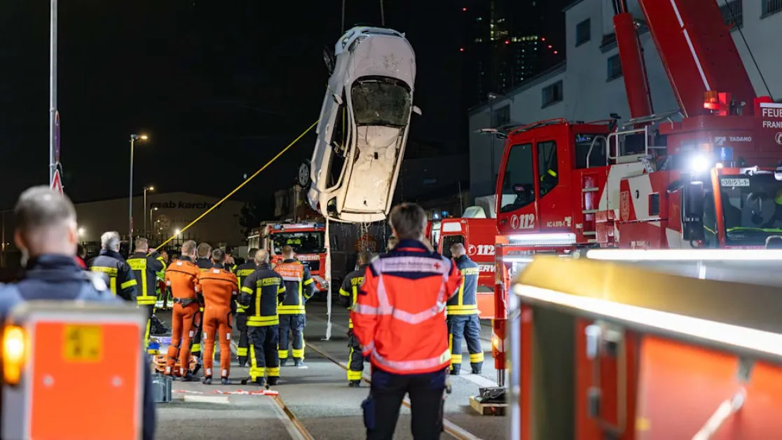 Колата е паднала от кея на източното речно пристанище на германския финансов център около 22:00 часа местно време вчера, когато очевидец се е обадил на службите за спешна помощ.