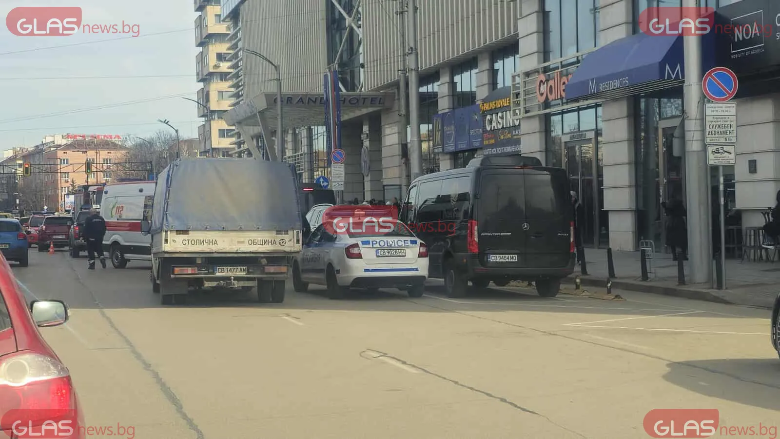 Сигнал за инцидент предизвика намеса на спешните служби пред хотел, разположен на столичния булевард „Витоша“ №89В, предава репортер на GlasNews.bg.
