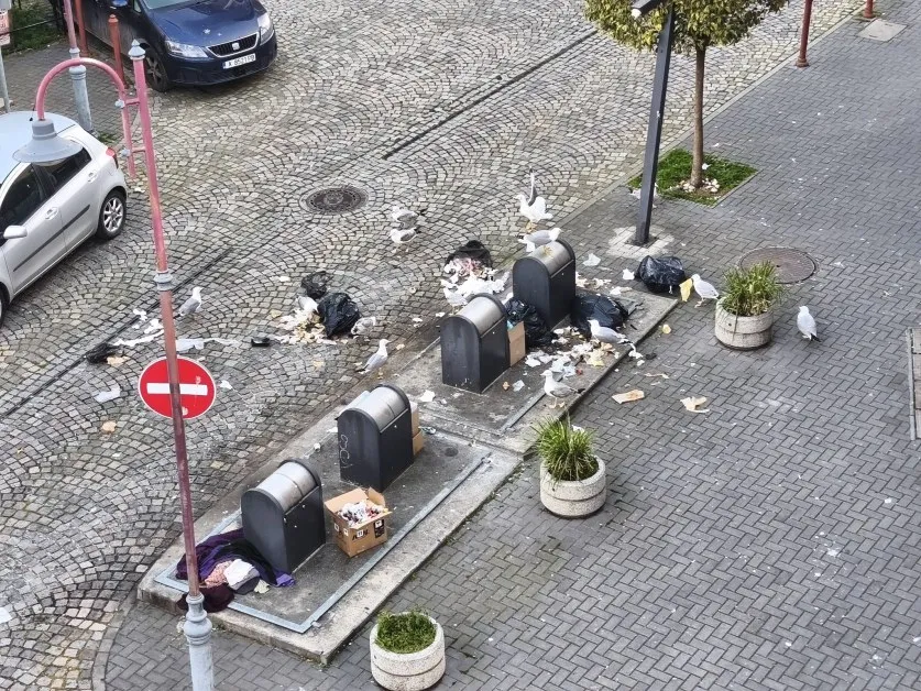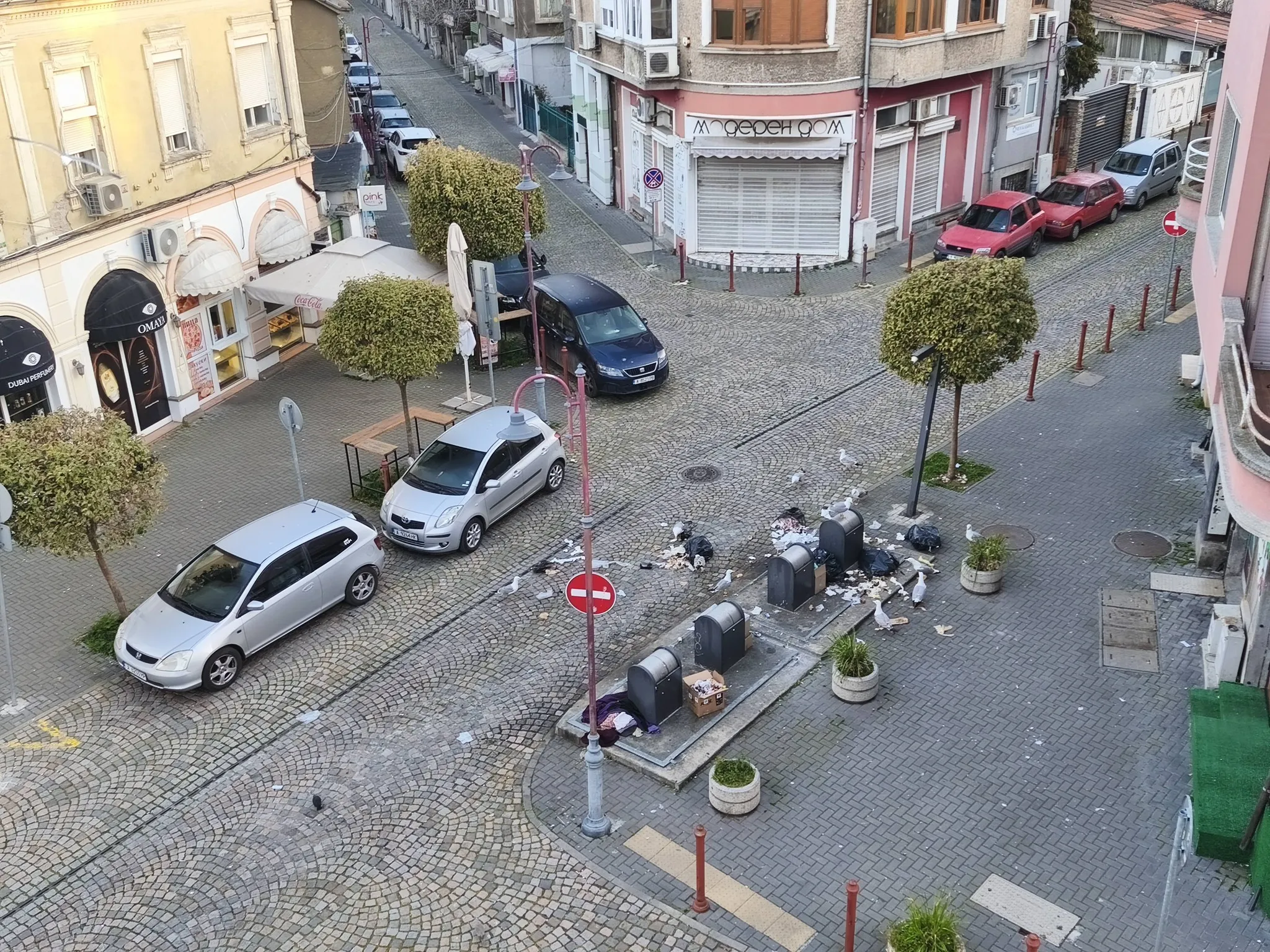 Поредна гледка с разпилени отпадъци в центъра на Бургас предизвика възмущение в социалните мрежи. Снимки, публикувани от местен жител, показват контейнери, около които са разхвърляни торби с боклук, храна и отпадъци, разнасяни от птици по тротоара и уличното платно.