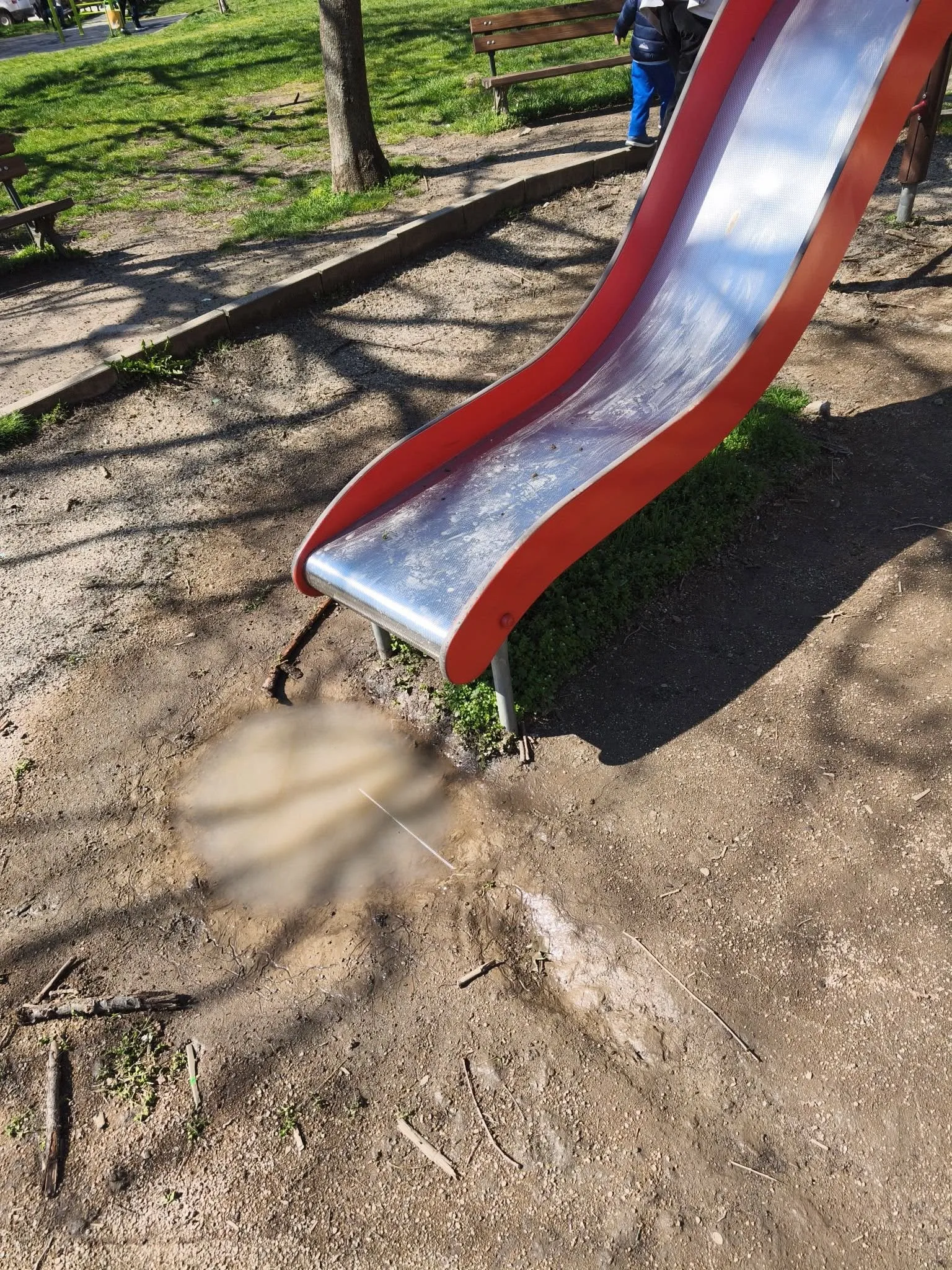 Повод за реакцията ѝ е видимо компрометирана зона около детско съоръжение, където вместо безопасна настилка има кал и локва пълна с вода. Своеобразният басейн за приземняване след спускане по пързалката, създава реален риск за децата, които използват площадката ежедневно.