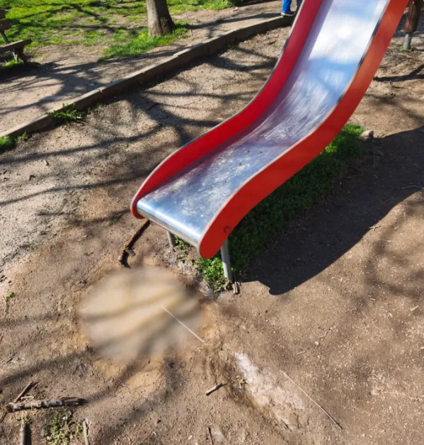Повод за реакцията ѝ е видимо компрометирана зона около детско съоръжение, където вместо безопасна настилка има кал и локва пълна с вода. Своеобразният басейн за приземняване след спускане по пързалката, създава реален риск за децата, които използват площадката ежедневно.