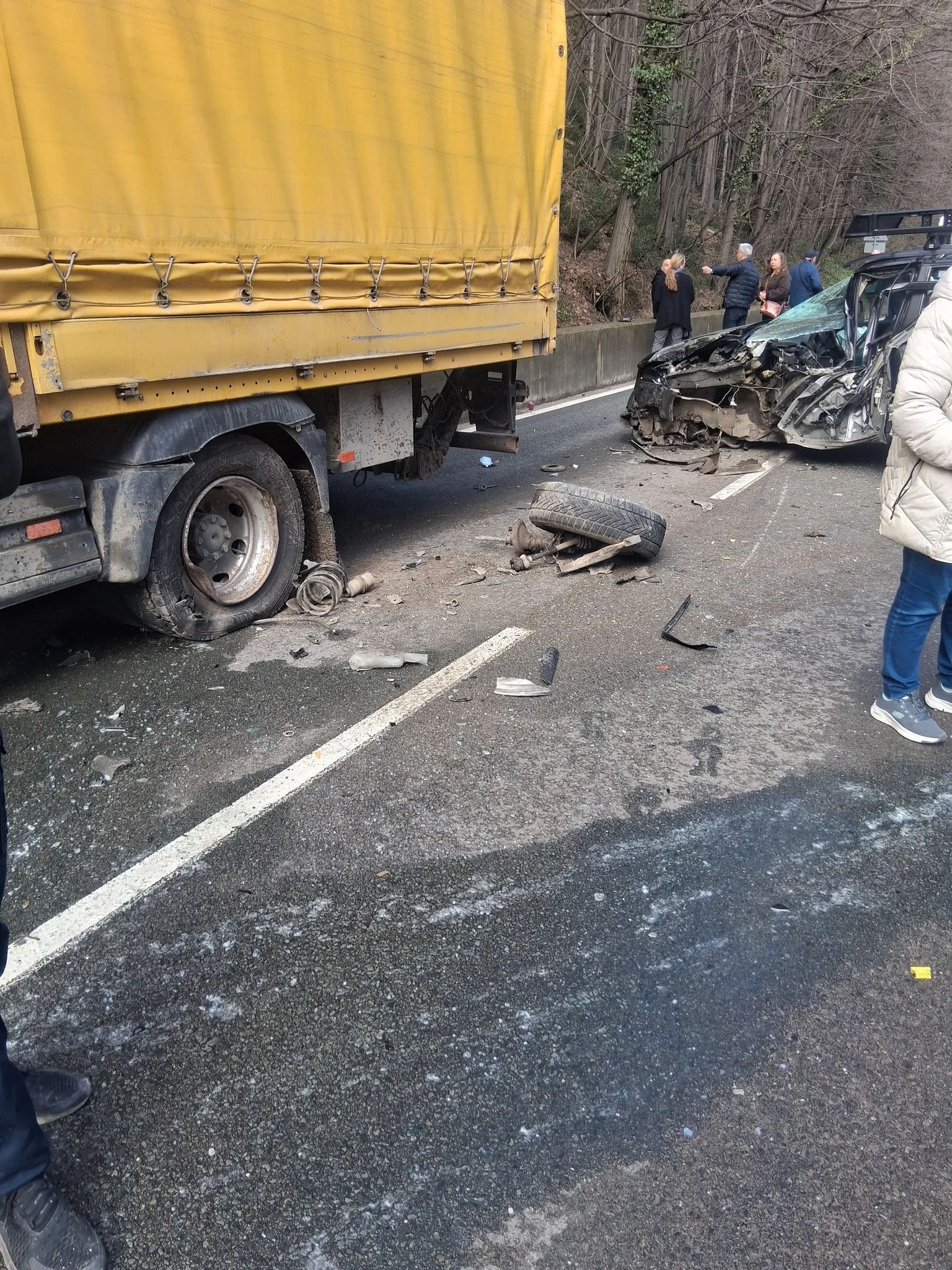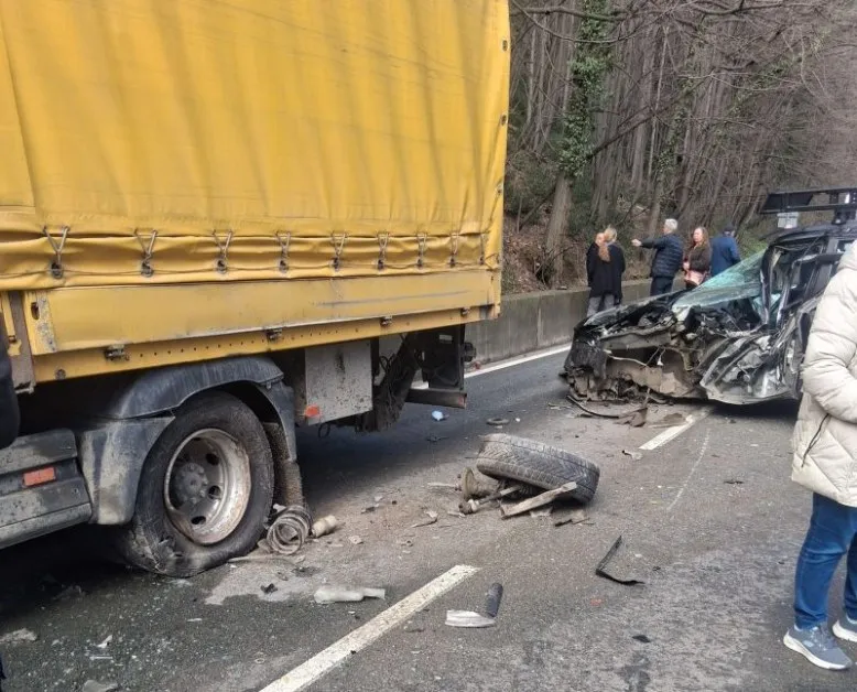 Снимки от мястото показват сериозно пострадал лек автомобил, чиято предна част е буквално смазана след удар с тир. При сблъсъка едно от колелата на колата е откъснато и изхвърлено на пътното платно, а отломки са разпилени в района.
