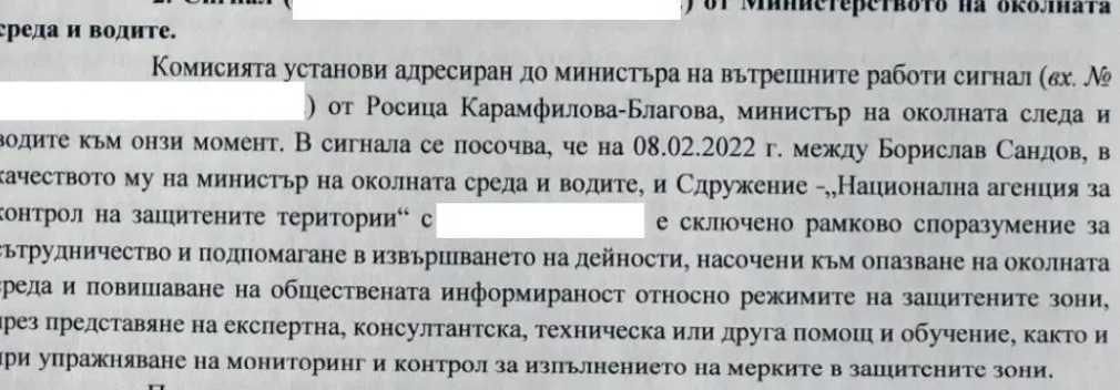 Името на бившия служебен министър Иван Демерджиев се споменава във връзка с друг сигнал. До него е бил изпратен сигнал от служебния министър на околната среда и водите Росица Карамфилова – Благова относно рамково споразумение между нейния предшественик Борислав Сандов и „Национална агенция за контрол на защитените територии“. Въпросното споразумение няма подпис и изходящ номер, но въпреки това е публикувано на сайта на сдружението и предвижда осъществяване на системен контрол и мониторинг за спазването на екологичните изисквания в защитени територии. Според сигнала по този начин се изземват функции на МОСВ, които са изрично регламентирани със закон и не могат да бъдат делегирани на частни структури.