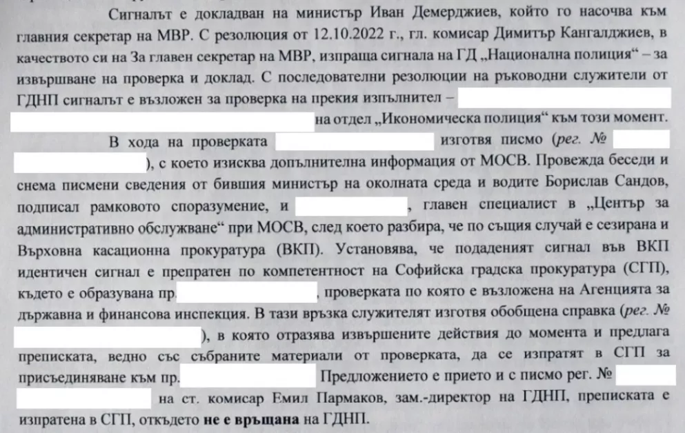 От документа става ясно, че един от сигналите е бил лично докладван на Демерджиев, докато е начело на вътрешното ведомство, а първият подаден сигнал в ГДБОП е бил прекратен именно през периода, в който той е министър, поради изтичане на срока на проверката.