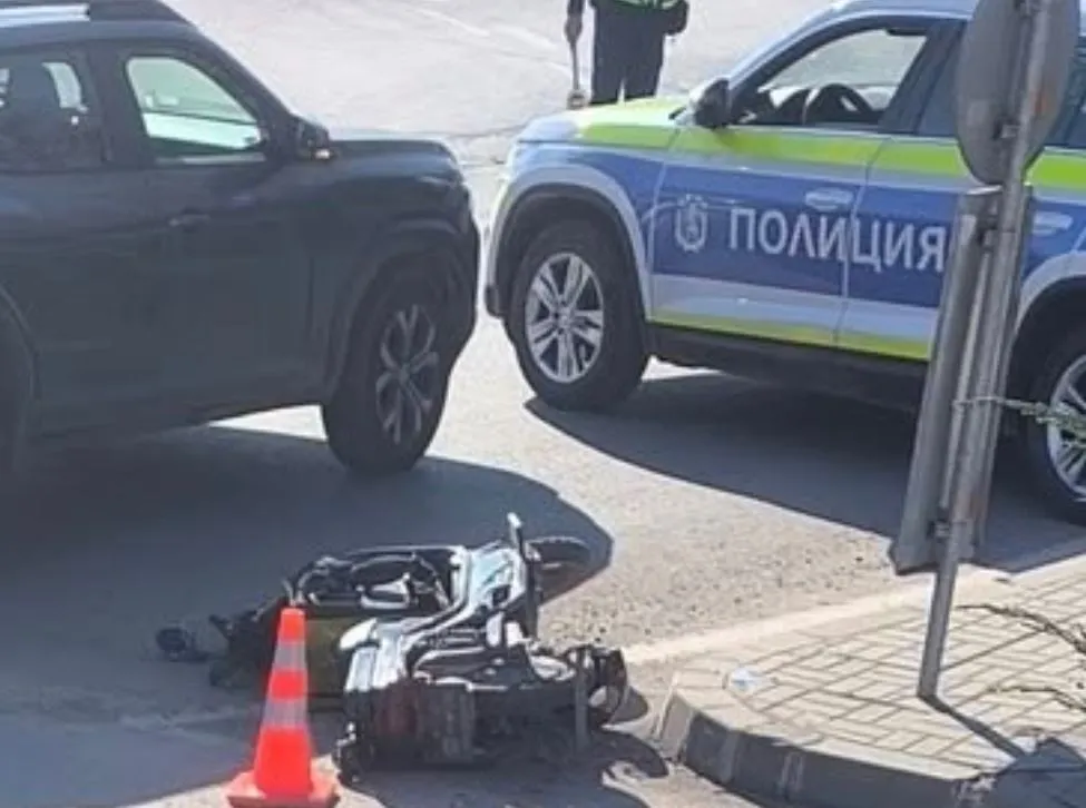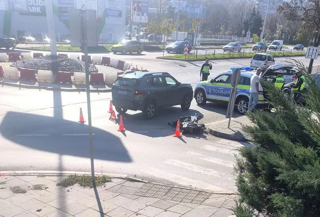 Мотопед лежи на асфалта до спряна "Дачия", показват кадри, разпространени от граждани.