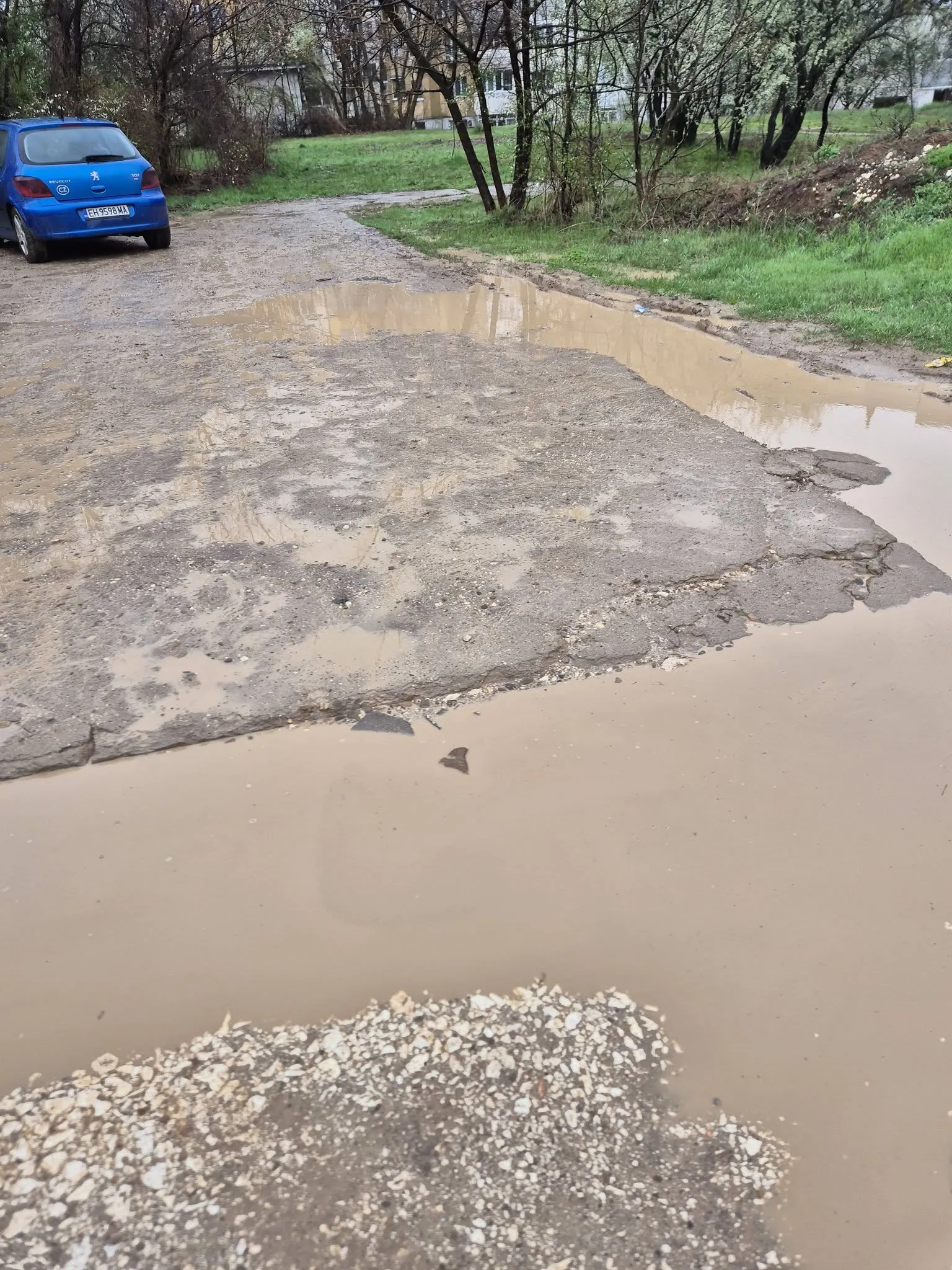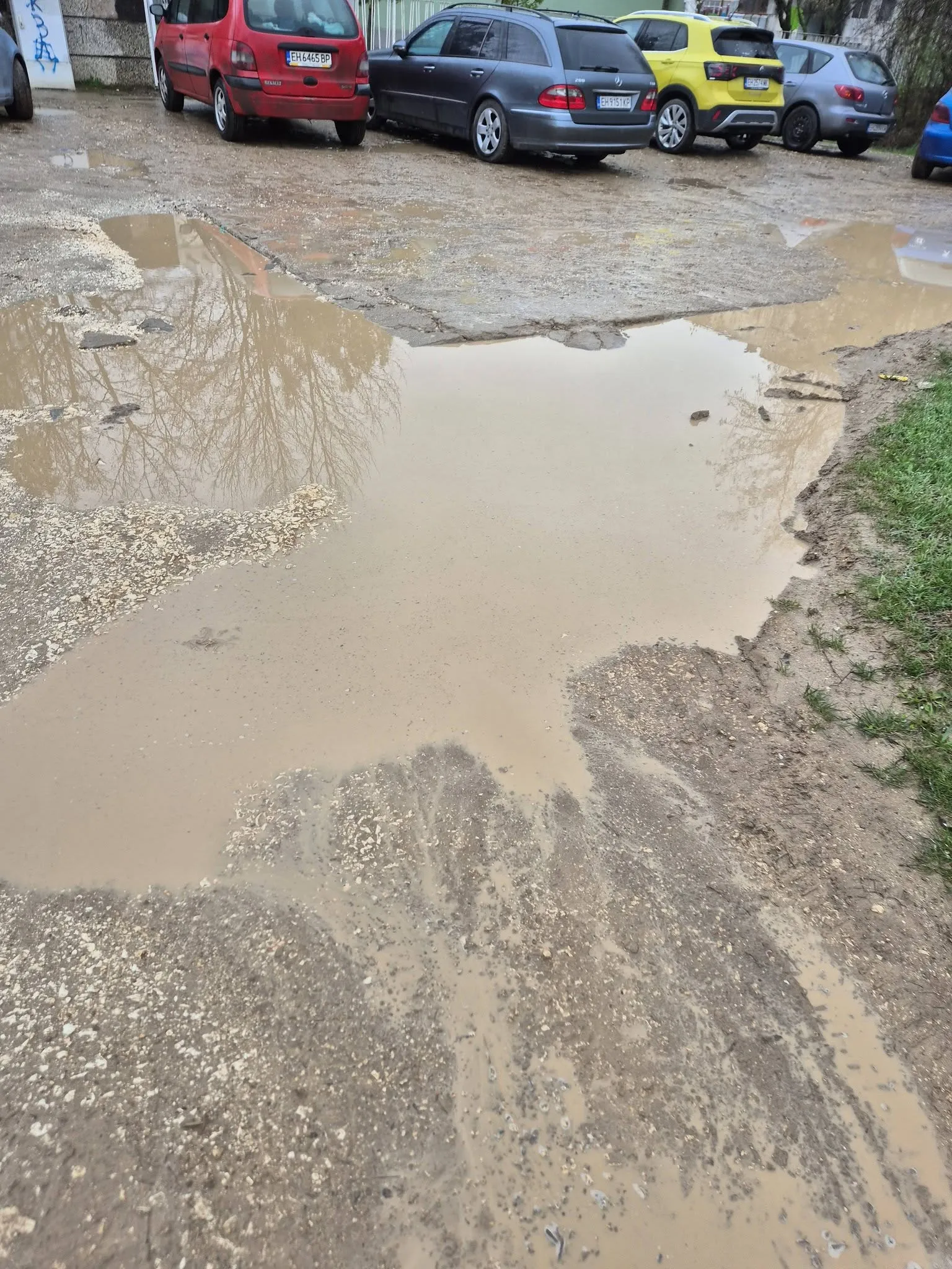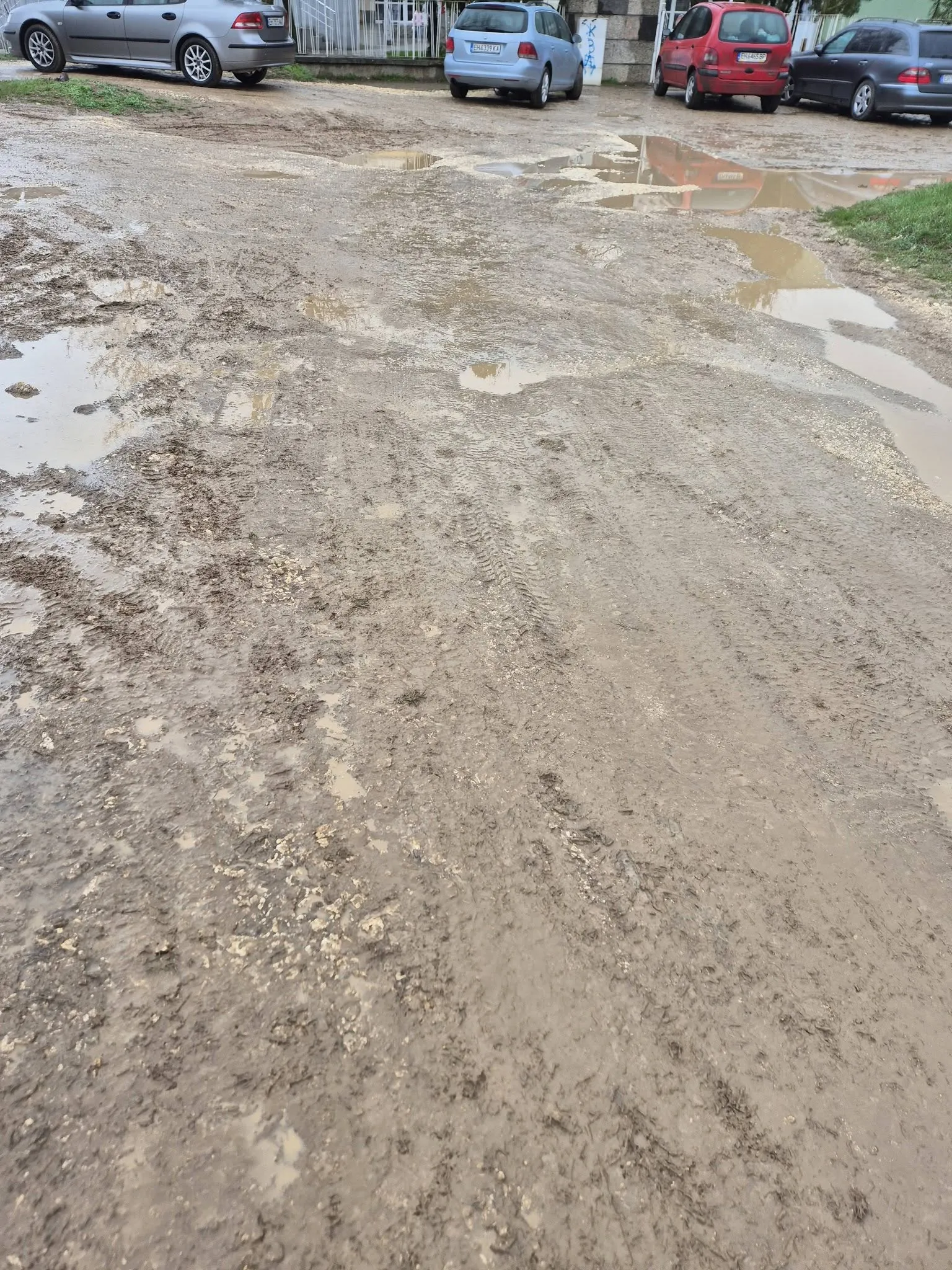„Ако не е пепел, ще е кал до шия!“ – така жител описва абсурдната ситуация пред детска градина „Калина“ в Плевен. Снимки, публикувани в социалните мрежи, показват шокираща гледка – разбит път, огромни локви и кал, в която буквално затъват преминаващите.
